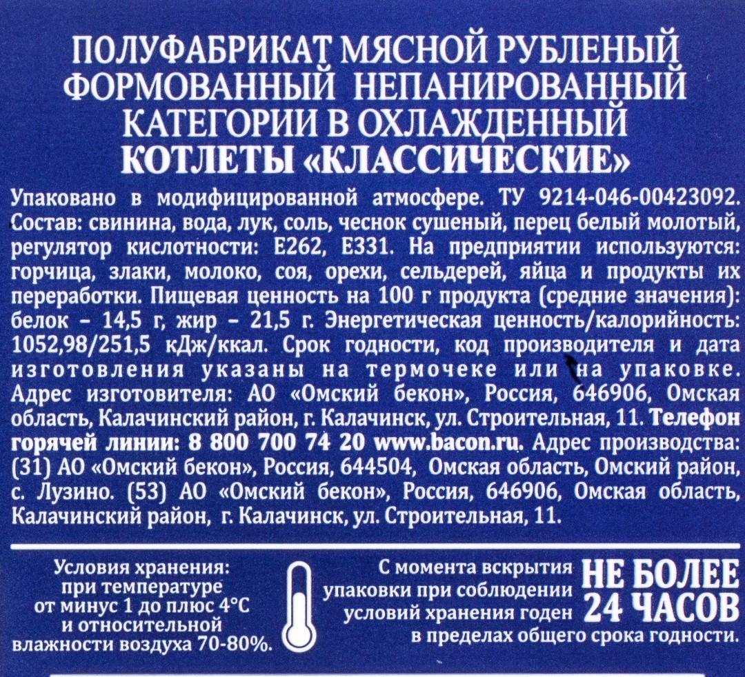 Свинина, вода, лук, соль, чеснок сушеный, перец белый молотый, регулятор кислотности: Е262, Е331. На предприятии используются: горчица, злаки, молоко, соя, орехи, сельдерей, яйца и продукты их переработки.