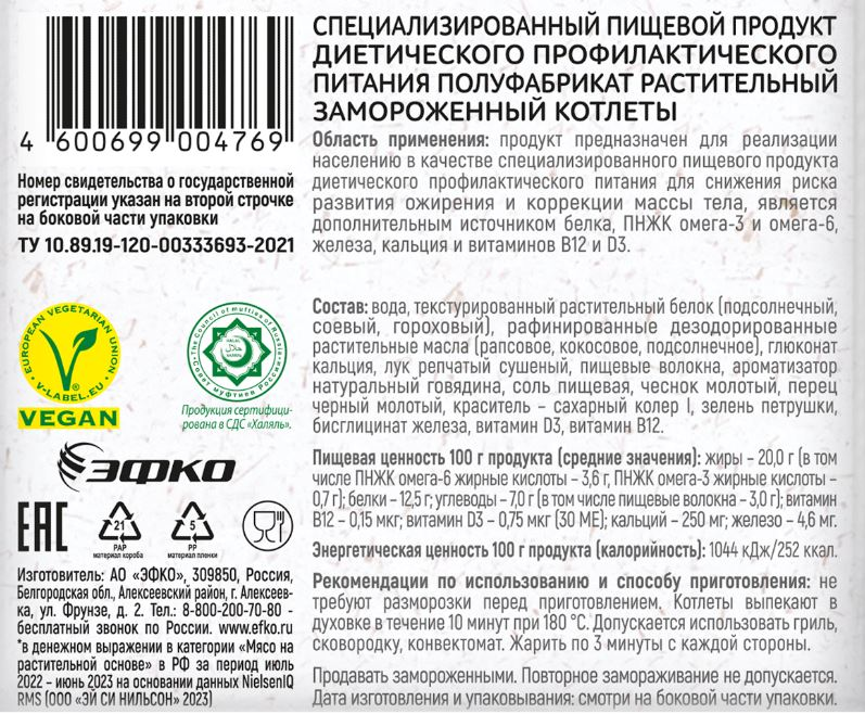 Котлеты растительные Hi для бургера замороженные, 400г - это инновационные продукты для тех, кто бережно относится к своему здоровью. Полезная альтернатива классическому мясу, которая не уступает ему по вкусу и пищевой ценности. Станут отличной основой для сытного бургера. Такое блюдо подойдет для сбалансированного перекуса, а его приготовление не займет у вас много времени. Просто пожарьте котлеты по две минуты с двух сторон на сковороде и выложите на хрустящую булочку ингредиенты - свежие овощи, тающий сыр и пикантные соусы. Мясо Hi сделает бургер по-настоящему сочным и порадует насыщенным вкусом. Растительное мясо Hi содержит Омега-3, Омега-6, железо и кальций и обогащены витаминами D3 и B12. Подходит для питания: веган, вегетарианцы, халяль, пост, фитнес, диета при избыточном весе. Специализированный пищевой продукт диетического профилактического питания.