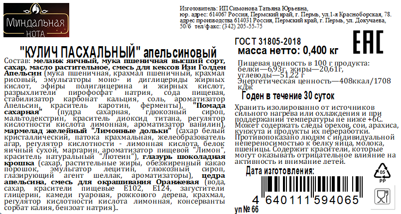 Кулич Пасхальный Миндальная нота апельсиновый, 400г