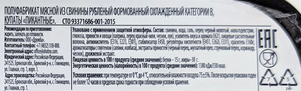 Свинина, вода, соль, перец чёрный молотый, мальтодекстрин, глюкоза, пряности и овощи паприка, перец красный чили, чеснок, лук, усилитель вкуса и аромата Е621, пищевые растительные волокна, антиокислитель Е316, Е223, Е301, стабилизатор Е450, регуляторы кислотности Е451, Е262i, Е331, краситель Е160с, ароматизаторы с глютеном салями, колбаса, экстракты пряностей чёрный перец, мускатный орех, стручковый перец, кориандр, чеснок, дрожжевой экстракт.