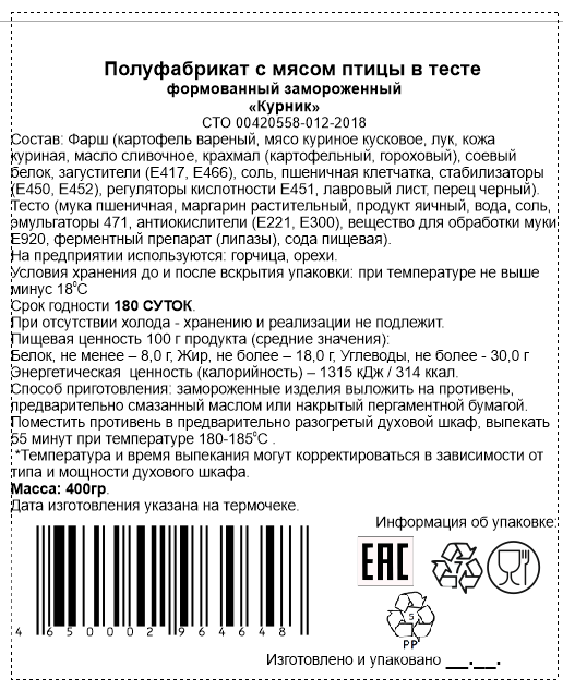 Фарш картофель варёный, мясо куриное кусковое, лук, кожа куриная, масло сливочное, крахмал картофельный, гороховый, соевый белок, загустители Е417, Е466, соль, пшеничная клетчатка, стабилизаторы Е450, Е452, регулятор кислотности Е451, лавровый лист, перец чёрный; тесто мука пшеничная, маргарин растительный, продукт яичный, вода, соль, эмульгаторы 471, антиокислители Е221, Е300, вещество для обработки муки Е920, ферментный препарат липазы, сода пищевая.