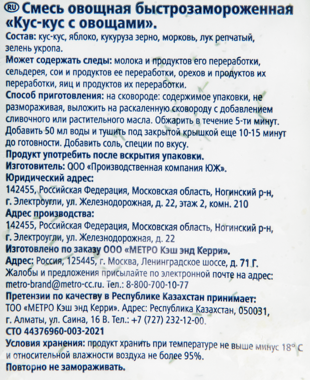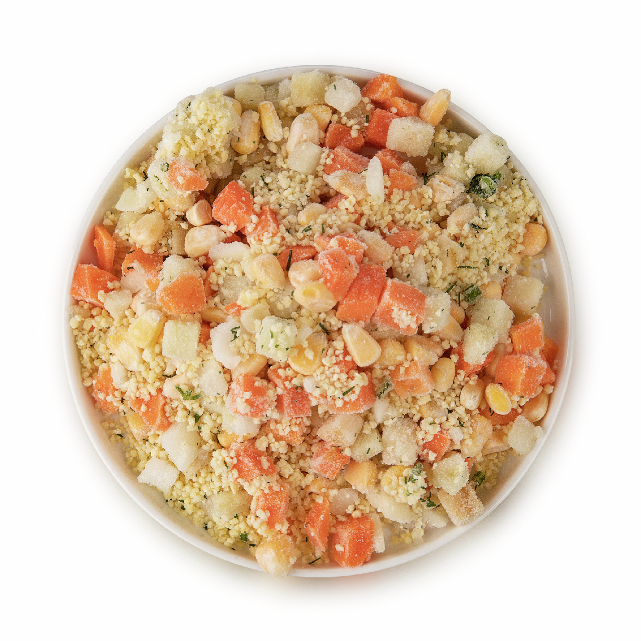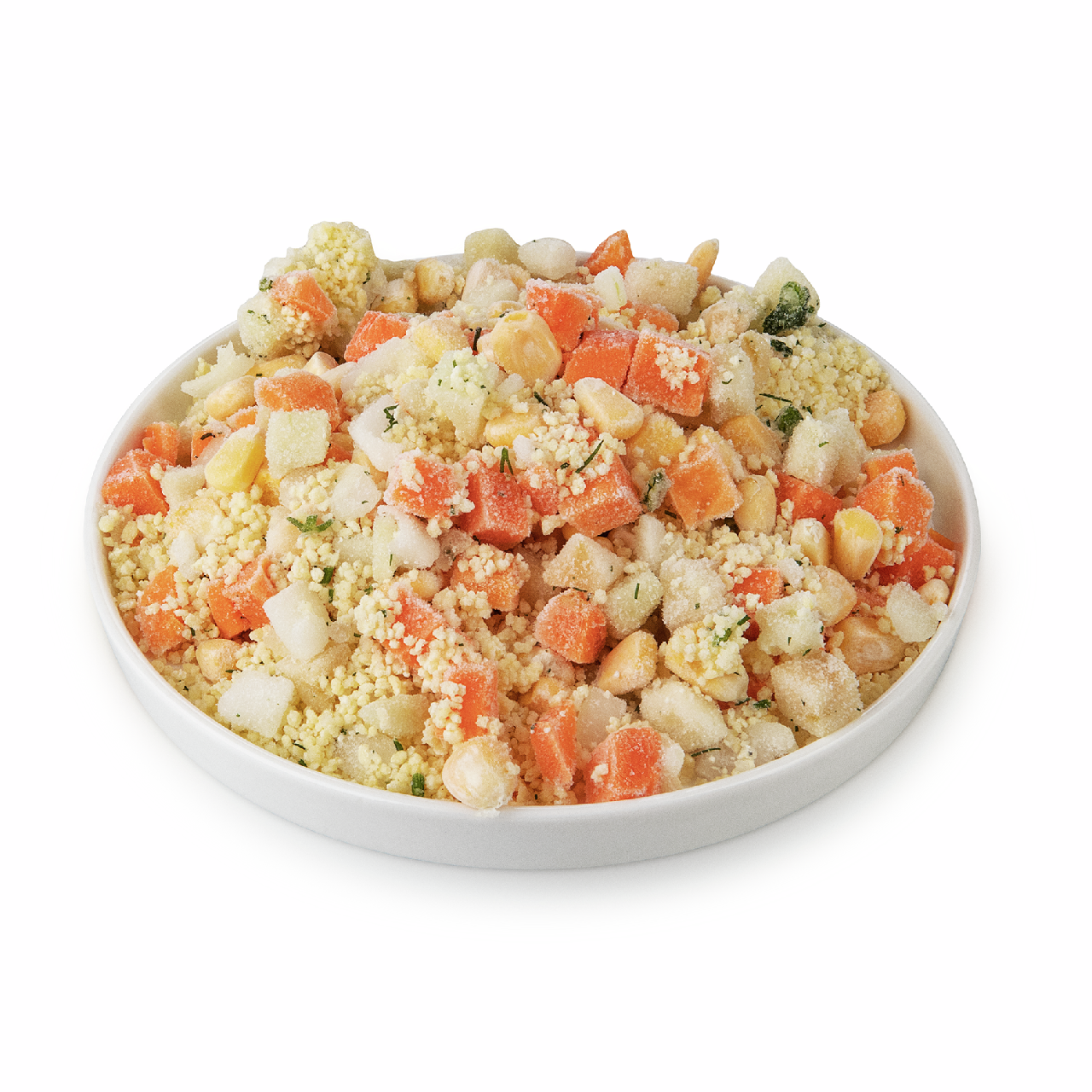 Смесь с неповторимым восточным колоритом - кус-кус из твердых сортов пшеницы и пряный соус с легким ароматом мяты. Позволит быстро приготовить аппетитное блюдо с выразительным ярким вкусом. Благодаря технологии быстрой заморозки в продуктах сохраняется максимум витаминов и полезных элементов. Смесь очень проста в приготовлении: уже нарезанные овощи следует слегка обжарить на сковороде с небольшим количеством растительного масла или приготовить в микроволновке. При жарке смесь источает ярко выраженный пряный аромат, в котором легко угадать мяту и кумин. Во время приготовления овощи успевают приготовиться и не превращаются в кашицу. Блюдо прекрасно подходит к мясу как гарнир или может выступать в качестве полноценного самостоятельного блюда.