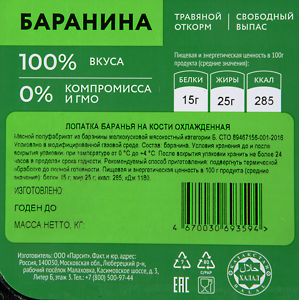 Охлажденная баранья лопатка на кости халяль от Мясо есть! — это натуральный продукт, который компания производит на своих собственных фермах в Липецкой области. Сертификат Халяль подтверждает гигиеническую чистоту животного, полное удаление крови естественным путем, отсутствие вредных добавок и консервантов. Лопатка — это порционный мясокостный отруб из передней части бараньей туши. Лучше всего запечь его в духовке целиком или приготовить рубленые котлеты, плов, шашлык, рагу, азу или жаркое.