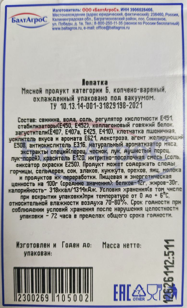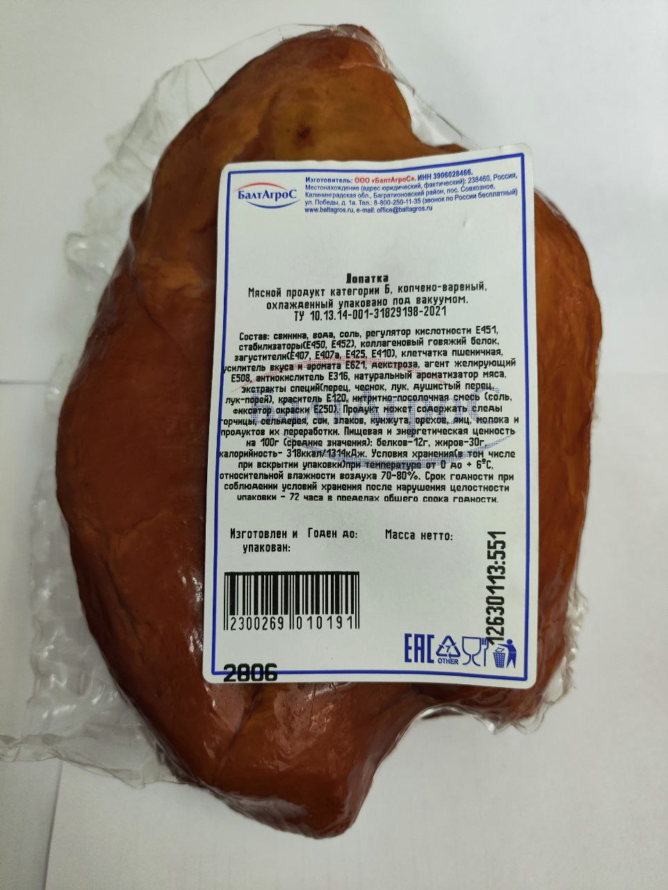 Лопатка Балтагрос копчено-вареная, ~400г