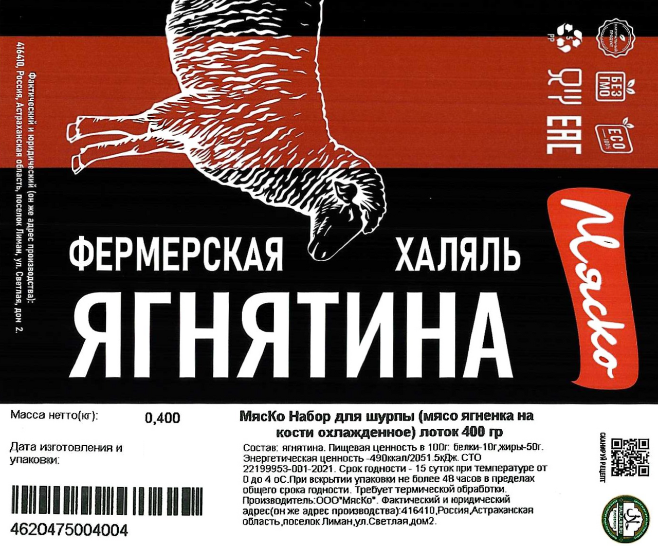 Мясо ягненка Мяско Халяль набор для шурпы на кости охлажденное, 400г