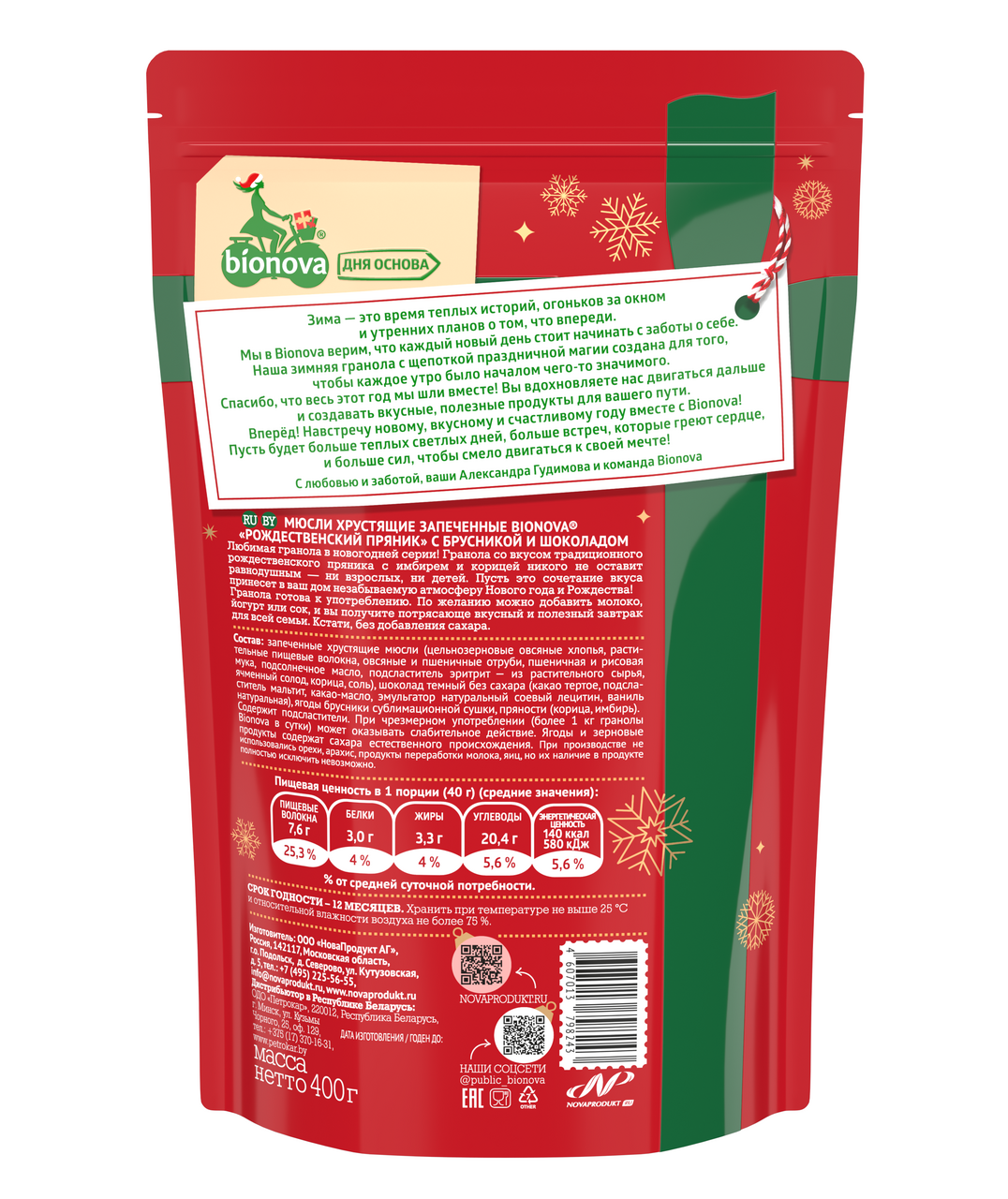 Мюсли Bionova хрустящие запеченные с брусничным пряником, 400г