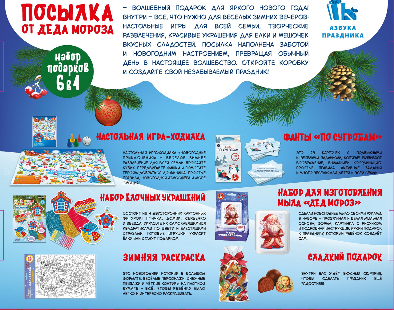 Новогодний сладкий подарок Азбука Праздника Набор 6 в 1 Посылка Деда Мороза - это яркая красочная упаковка, которую так приятно подарить ребёнку. Внутри множество удивительных и полезных сюрпризов из разнообразных настольных игр и предметов для рукоделия, которые помогут каждому исследовать, играть и развиваться. Ребенку доставит большое удовольствие замечательный набор сладостей от лучших российских кондитерских фабрик.Внутри вы найдете 5 наборов для творчества и игры с близкими или друзьями, которые подходят для детей от 5 лет:1. Набор для творчества. Раскраска Зимняя;2. Набор для творчества. Аппликация Набор елочных украшений 1;3. Набор для изготовления мыла. Рукодельное мыло с картинкой Дед Мороз;4. Игра настольная Фанты. По сугробам;5. Игра-ходилка настольная Новогодние приключения (европодвес).