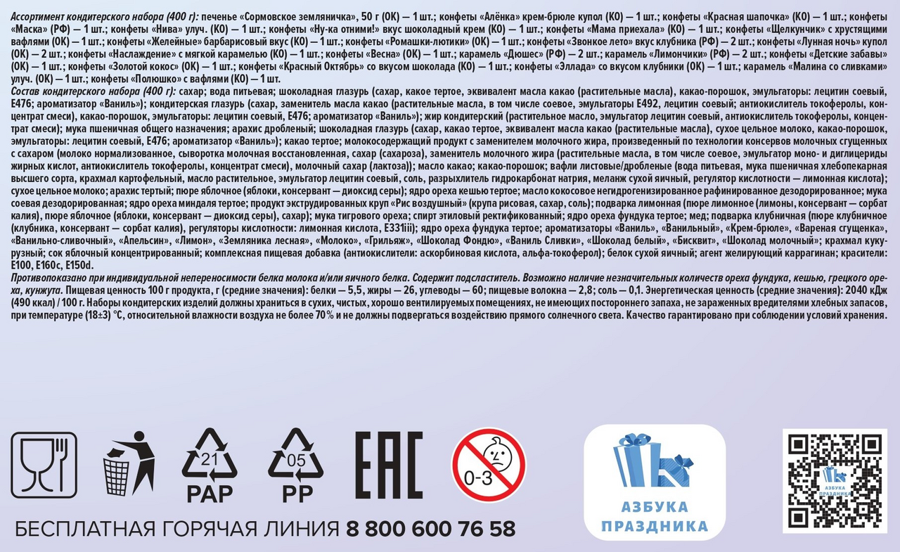 Сахар, кондитерская глазурь сахар, заменитель масла какао растительные масло, в том числе Соевое, эмульгаторы: сорбитан тристеарат, лецитин соевый, антиокислитель, токоферолы, какао-порошок, соль, эмульгатор лецитин соевый, разрыхлитель гидрокарбонат натрия, масло подсолнечное рафинированное дезодорированное, Е171, жир кондитерский, Е471, Е475, молочный шоколад сахар, какао-тёртое, масло какао, сухое цельное молоко, патока, мука хлебопекарная высшего сорта, шоколадная глазурь, ароматизатор Ваниль, вода питьевая, сгущённое молоко с сахаром молоко нормализованное, сахар, лактоза, антиокислители, орехи тёртые, сухая молочная сыворотка, Е432, Е433, желирующие агенты: пектин, агар, влагоудерживающий агент сорбитовый сироп, регуляторы кислотности: лимонная кислота, консервант сорбат калия.