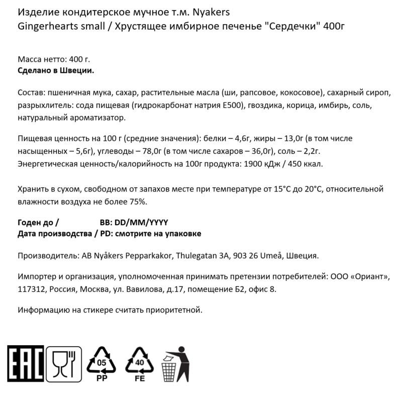 Шведская семейная компания Nyakers Pepparkakor, существующая с 1952 года, в настоящее время является одной из крупнейших на шведском рынке имбирного печенья. Ее продукция экспортируется в страны по всему миру. Подарочная красная банка с тонким имбирным печеньем станет особенным подарком и изюминкой на любом праздничном столе. Ароматное и восхитительно вкусное имбирное печенье, отмеченное многими европейскими наградами, имеет приятную хрустящую корочку, которая порадует даже самых изысканных гурманов. Постный продукт. Тонкое печенье обладает хрустящей рассыпчатой консистенцией, а уникальный богатый вкус с тёплыми нотами имбиря и корицы располагает к приятному чаепитию. Душистое лакомство Nyakers приготовлено по старинному рецепту семейной компании, созданной двумя братьями в середине прошлого столетия, который до сих пор остается засекреченным. Нарядная упаковка с милыми сердечками станет отличным подарком вашим родным и близким.
