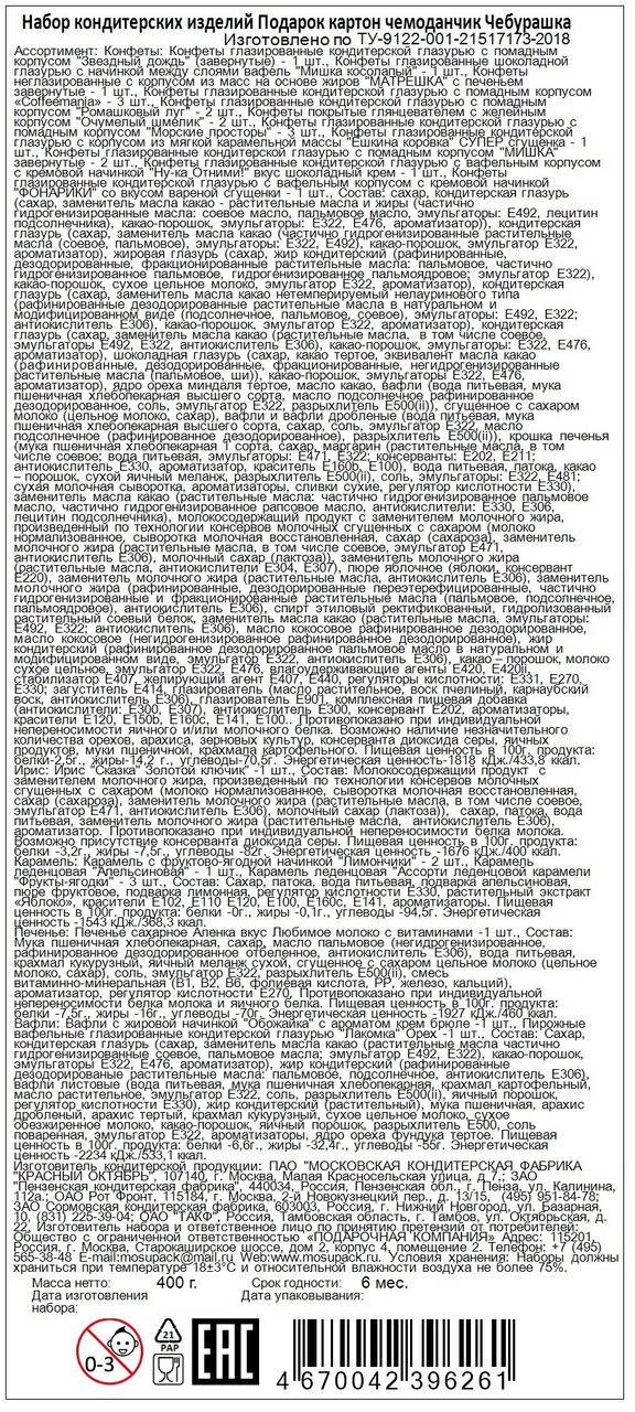 Содержит кондитерские изделия кондитерских фабрик Красный Октябрь, Пензенская кондитерская фабрика, Рот Фронт, Сормовская кондитерская фабрика, ТАКФ. Один из самых известных героев советских мультфильмов, Чебурашка Забавный персонаж не оставит равнодушным ни одного ребенка. Такой презент станет приятным дополнением к новогоднему торжеству и здорово впишется в весёлую атмосферу детского праздника. Кондитерские изделия упакованы в отдельный пластиковый пакет, который находится внутри картонной коробочки.