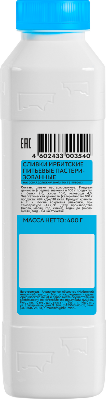 Сливки Ирбитское пастеризованные питьевые 10%, 400г