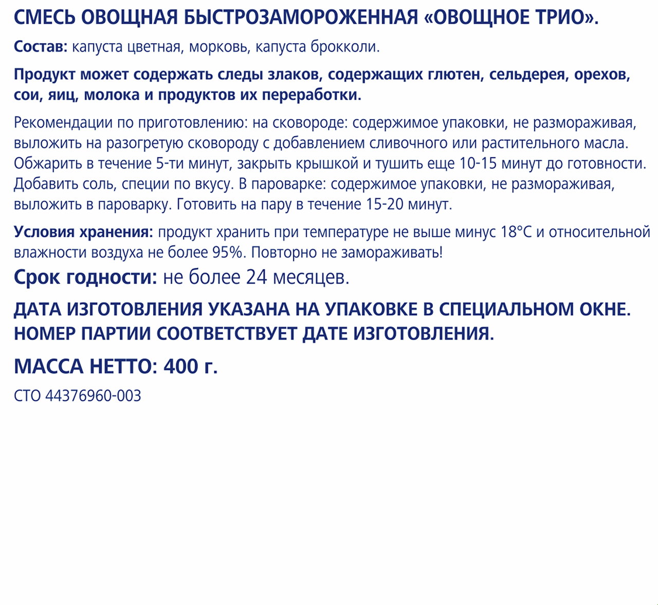 Удобная смесь из трёх овощей. Легко готовить. На сковороде: содержимое упаковки, не размораживая, выложить на разогретую сковороду с добавлением сливочного или растительного масла. Обжарить в течение 5-ти минут, закрыть крышкой и тушить еще 10-15 минут до готовности. Добавить соль, специи по вкусу. В пароварке: содержимое упаковки выложить в пароварку. Готовить на пару в течение 15-20 минут. Позволит быстро приготовить легкий овощной суп, аппетитный гарнир к мясу, рыбе или птице. Благодаря высокому содержанию полезных элементов и небольшой калорийности такой продукт станет ценным дополнением к диетическому меню. Перед употреблением смесь следует прогреть на сковороде до готовности или отварить (предварительная разморозка не требуется). Это легкий диетический гарнир к мясу, птице или рыбе, основа для овощного супа или рагу. Продукт не содержит ГМО, консерванты и искусственные добавки.