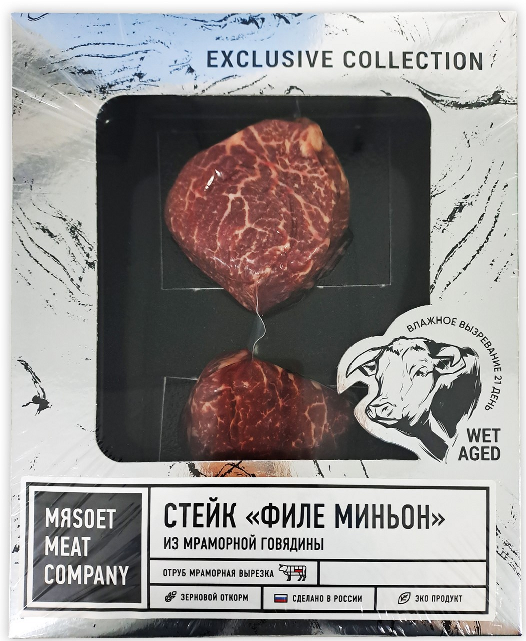 Филе-Миньон - это изысканный деликатес известный во всем мире благодаря своей неповторимо нежной текстуре. Стейки нарезают из отруба тендерлоин расположенной в поясничной части бычка. Благодаря высшей категории мраморности, стейки обладают нежной маслянистой текстурой и прекрасной сочностью. Продукт изготовлен из российской мраморной говядины высшего качества от бычков легендарной породы Black Angus. Мясо не нужно дополнительно мариновать или обрабатывать, чтобы сделать его мягче. Рекомендуемая степень прожарки для стейков филе-миньон - Medium rare или Rare.