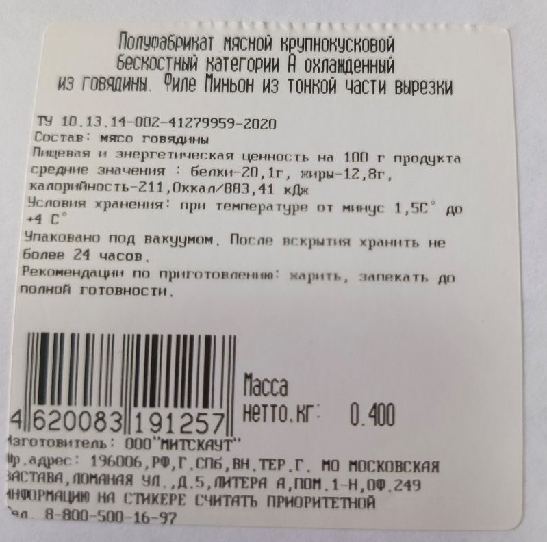 Стейк говяжий Myasoet Meat Company филе-миньон охлажденный, 400г