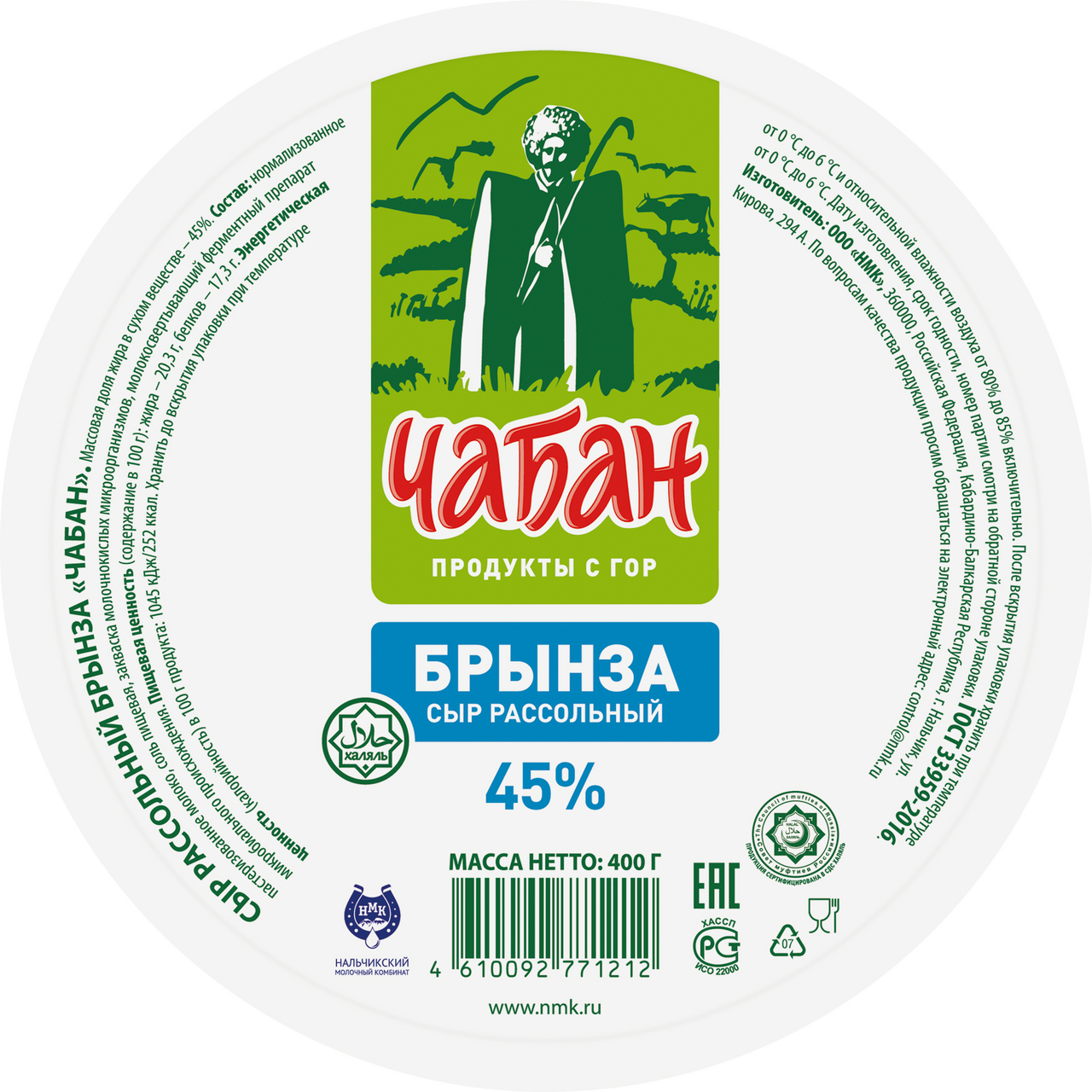 Сыр Брынза "Чабан" – абсолютно натуральный, экологически чистый продукт, произведен по стандартам Халяль. В продукции отсутствуют запрещенные компоненты для халяльной продукции: свиной пепсин и жир, заменители молока. Для производства используются лучшие высококачественные заквасочные культуры, приобретаемые у крупнейших производителей, поэтому продукция имеет прекрасный вкус и стабильное качество. Производство находится на суперсовременном предприятие, оснащенном новейшим европейским оборудованием со строжайшим контролем качества.
