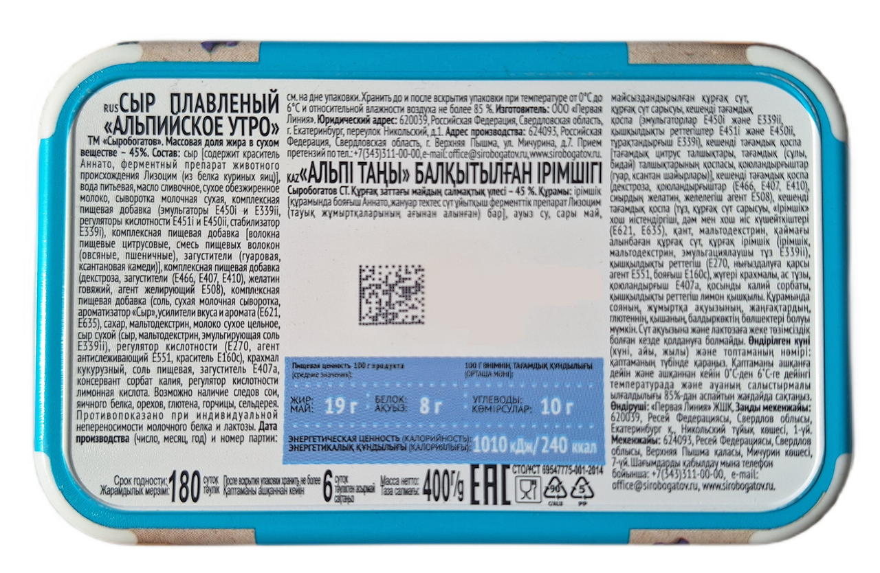 Сыр [содержит краситель Аннато, ферментный препарат животного происхождения Лизоцим из белка куриных яиц], вода питьевая, масло сливочное, сухое обезжиренное молоко, сыворотка молочная сухая, комплексная пищевая добавка эмульгаторы Е450i и Е339ii, регуляторы кислотности Е451i и Е450ii, стабилизатор Е339i, комплексная пищевая добавка [волокна пищевые цитрусовые, смесь пищевых волокон овсяные, пшеничные, загустители гуаровая, ксантановая камеди], комплексная пищевая добавка декстроза, загустители Е466, Е407, Е410, желатин говяжий, агент желирующий Е508, комплексная пищевая добавка соль, сухая молочная сыворотка, ароматизатор Сыр, усилители вкуса и аромата Е621, Е635, сахар, мальтодекстрин, молоко сухое цельное, сыр сухой сыр, мальтодекстрин, эмульгирующая соль Е339ii, регулятор кислотности Е270, агент антислеживающий Е551, краситель Е160с, крахмал кукурузный, соль пищевая, загуститель Е407а, консервант сорбат калия, регулятор кислотности лимонная кислота.