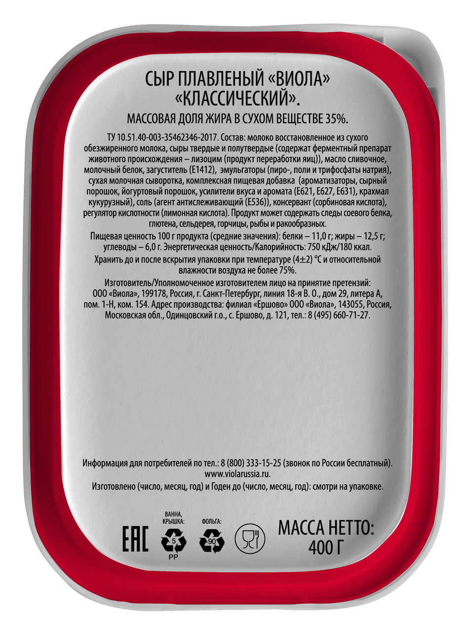Знакомый вот уже трем поколениям россиян, плавленый сыр Viola - это неизменная блондинка на упаковке и превосходный вкус внутри. Плавленый сыр Viola делается только из качественных натуральных ингредиентов по современной технологии и уникальной рецептуре. Для производства Viola используются твердые и полутвердые сыры, сливочное масло и сухое молоко, именно поэтому он получается таким вкусным и сливочным. Благодаря своему неизменно высокому качеству и вкусу, плавленый сыр Viola вот уже шесть раз становился обладателем почетной премии Товар года. C 2014 года плавленый сыр Viola в ваннах самых популярных вкусов по мнению покупателей (сливочный, с беконом, с ветчиной, с белыми грибами) производится в России на собственном заводе Viola в Ершово.