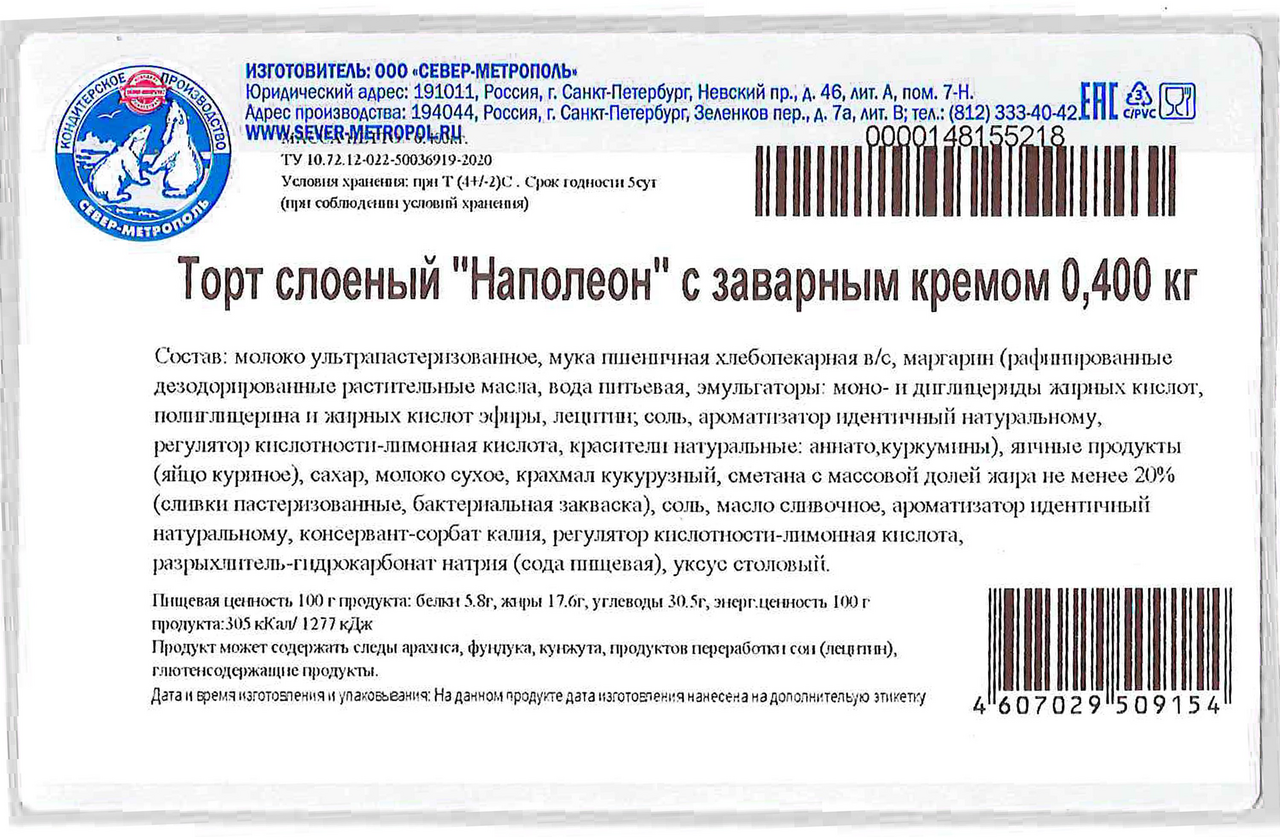 Торт Наполеон Север слоеный с заварным кремом, 400г