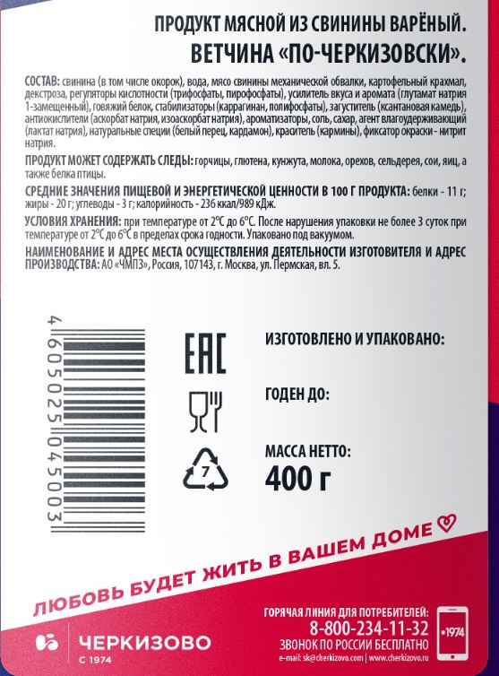 Свинина, вода, мясо свинины механической обвалки, картофельный крахмал, декстроза, регуляторы кислотности (трифосфаты, пирофосфаты), усилитель вкуса и аромата (глутамат натрия 1-замещенный), говяжий белок, стабилизаторы (каррагинан, полифосфаты), загуститель (ксантановая камедь), антиокислители (аскорбат натрия, изоаскорбат натрия), ароматизаторы, соль, сахар, агент влагоудерживающий (лактат натрия), натуральные специи (белый перец, кардамон), краситель (кармины), фиксатор окраски-нитрит натрия.