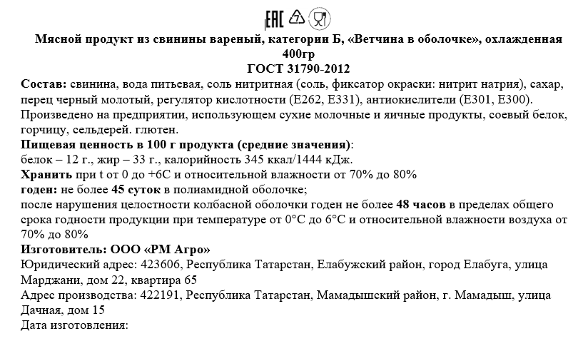 Свинина, вода питьевая, соль нитритная соль, фиксатор окраски: нитрит натрия, сахара, стабилизатор каррагинан, трифосфаты, пирофосфаты, краситель кармин, экстракты специй перец, чеснок, пряности регуляторы кислотности ацетат натрия, цитрат натрия, антиокислители аскорбат натрия, аскорбиновая кислота, усилитель вкуса и аромата глутамат натрия.