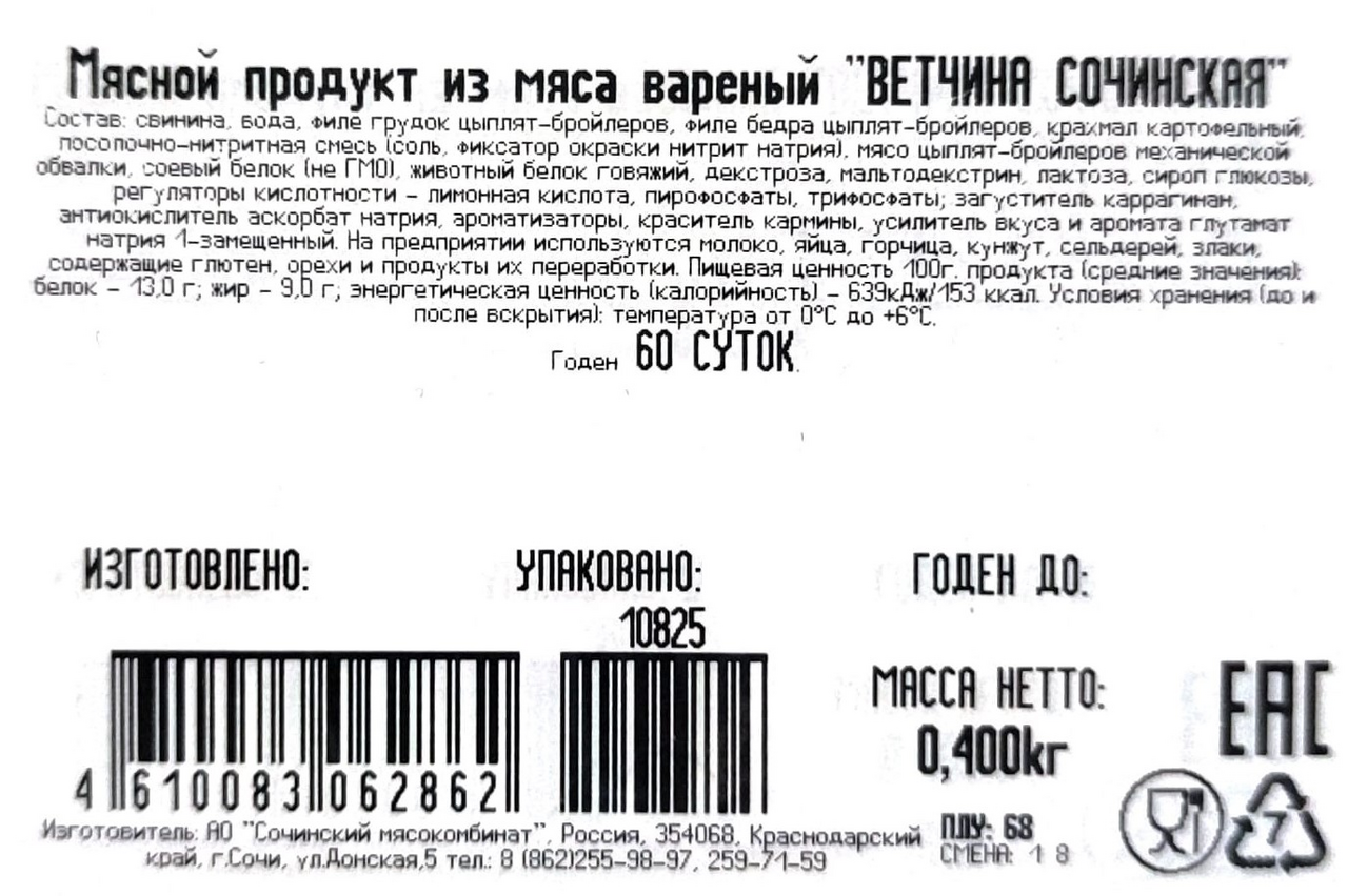 Ветчина Сочинский МК Сочинская вареная, 400г