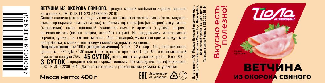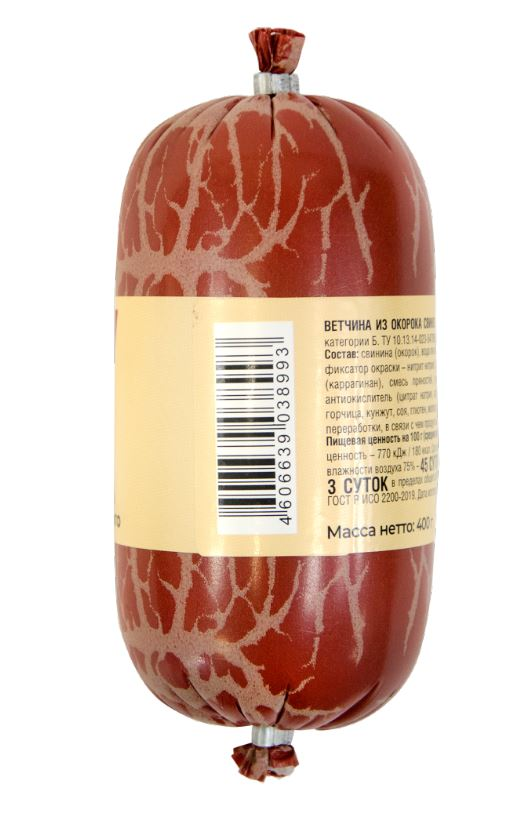 Свинина окорок, вода питьевая, нитритно-посолочная смесь соль пищевая, фиксатор окраски нитрит натрия, стабилизатор полифосфат натрия, загуститель каррагинан, смесь пряностей, усилитель вкуса и аромата глутамат натрия, антиокислитель цитрат натрия, аскорбат натрия.
