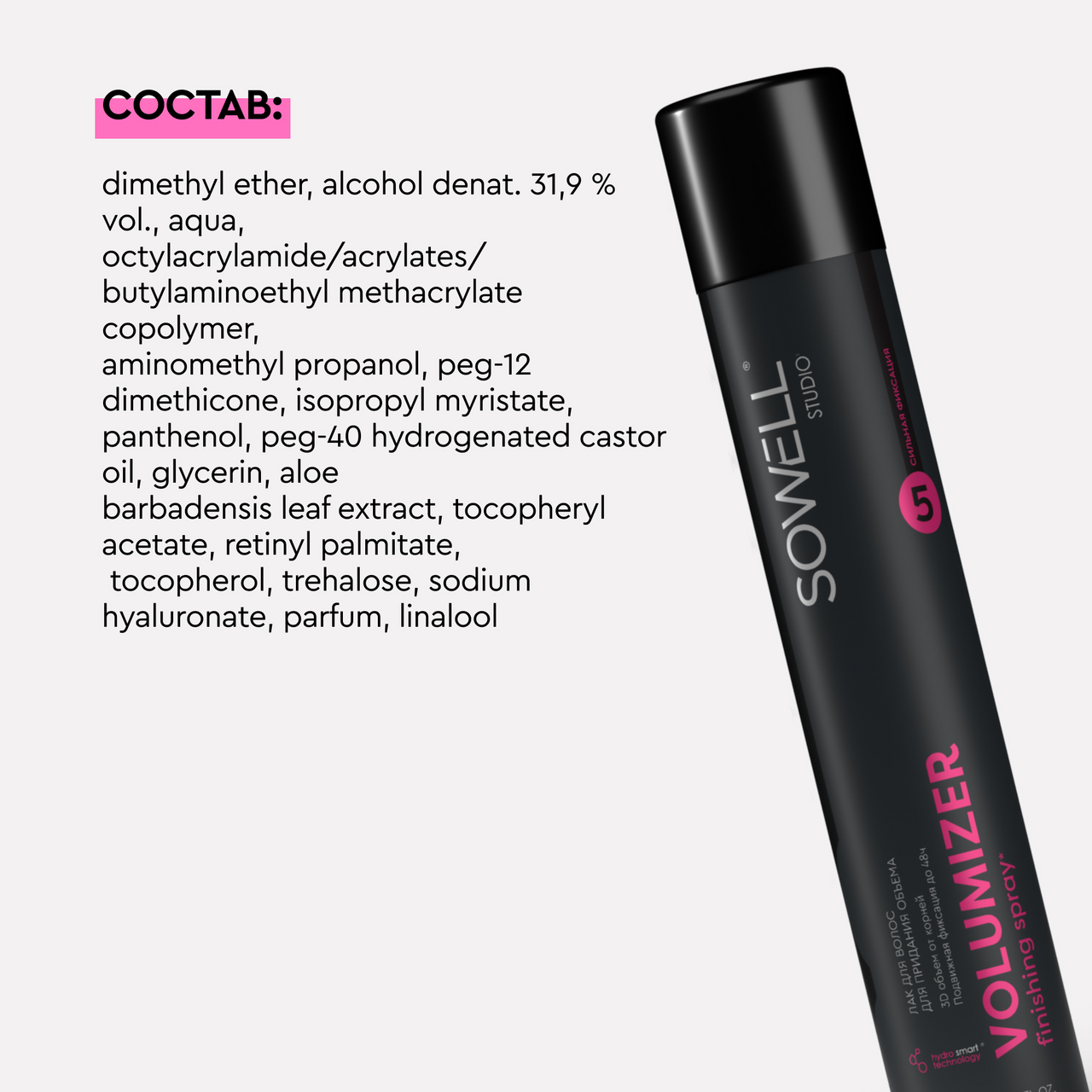 Лак SoWell Studio Volumizer - это профессиональное средство для укладки, которое придаст вашим волосам головокружительный прикорневой 3D объем и обеспечит подвижную фиксацию до 48 часов. Стайлинг идеально подойдет для обладательниц тонких, слишком мягких и длинных волос, надежно фиксируя, делая их упругими и эластичными. Средство эффективно защищает от влажности, помогает сохранить форму причёски в любую непогоду. В составе средства для ухода уникальный увлажняющий комплекс Hydro Smart Technology на основе гиалуроновой кислоты, пантенола, витаминов группы B, алоэ вера и других полезных микроэлементов, который наполняет локоны изнутри и обволакивает их снаружи, укрепляет и дает настоящую интеллектуальную защиту от обезвоживания.