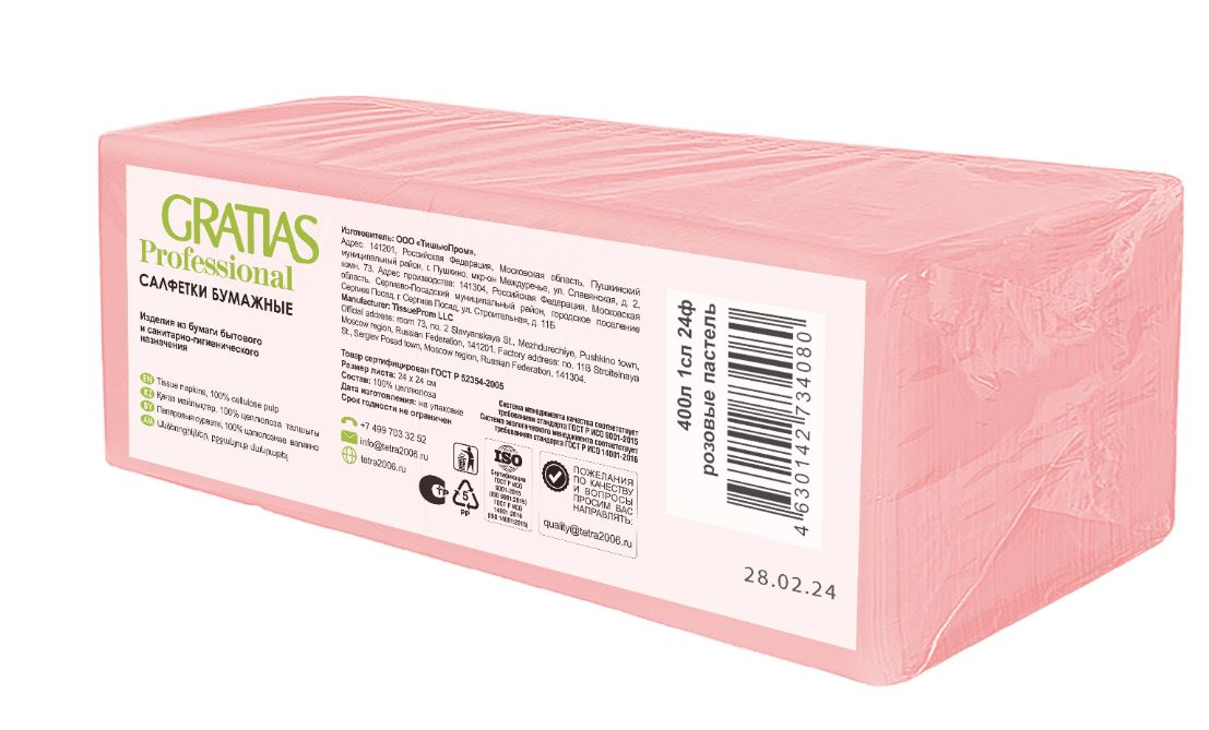 Салфетки бумажные Gratias Professional розовые пастельные однослойные 24см, 400шт