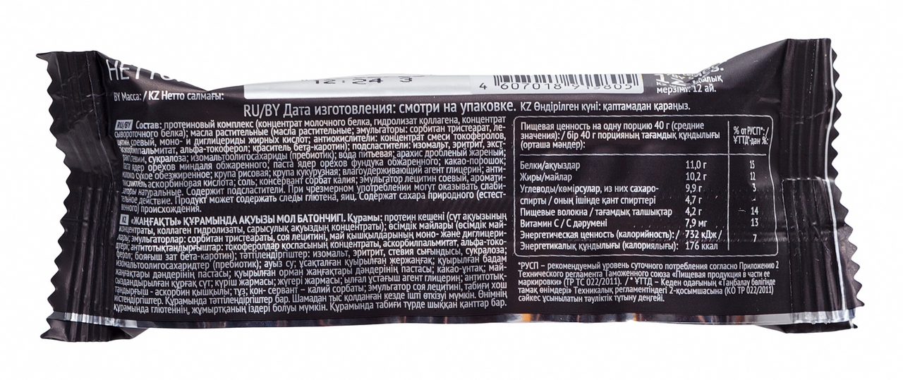 Протеиновый комплекс (концентрат молочного белка, гидролизат коллагена, концентрат сывороточного белка); масла растительные (масла растительные; эмульгаторы: сорбитан тристеарат, лецитин соевый, моно- и диглицериды жирных кислот; антиокислители: концентрат смеси токоферолов, аскорбилпальмитат, альфа-токоферол; краситель бета-каротин); подсластители: изомальт, эритрит, экстракт стевии, сукралоза; изомальтоолигосахариды (пребиотик); вода питьевая; арахис дробленый жареный; паста ядер орехов миндаля обжаренного; паста ядер орехов фундука обжаренного; какао-порошок; молоко сухое обезжиренное; крупа рисовая; крупа кукурузная; влагоудерживающий агент глицерин; антиокислитель аскорбиновая кислота; соль; консервант сорбат калия; эмульгатор лецитин соевый, ароматизаторы натуральные. Содержит подсластители. При чрезмерном употреблении могут оказывать слабительное действие. Продукт может содержать следы глютена, яиц.