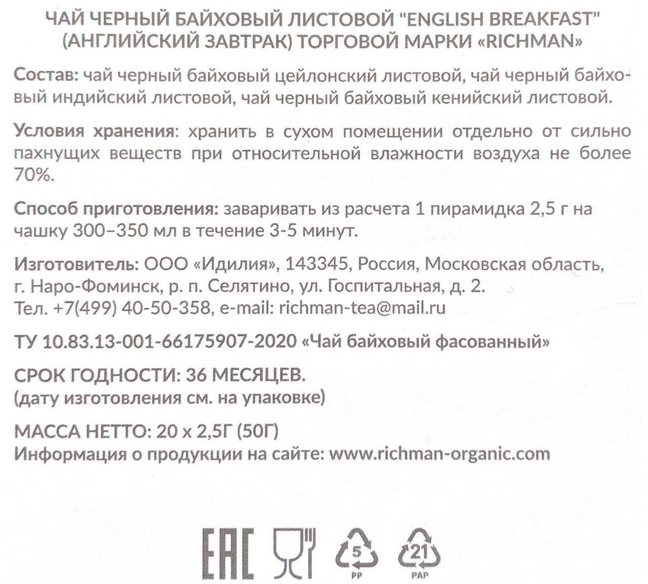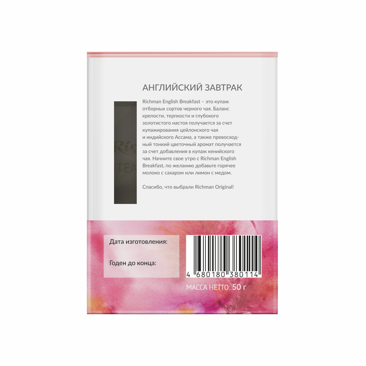 Richman English Breakfast – это купаж отборных сортов черного чаев. Баланс крепости, терпкости и глубокого золотистого настоя, получается за счет купажирования цейлонского чая и индийского Ассама, а также превосходный тонкий цветочный аромат получается за счет добавления в купаж кенийского чая. Начните свое утро с Richman English Breakfast, по желанию добавьте горячее молоко с сахаром или лимон с медом.