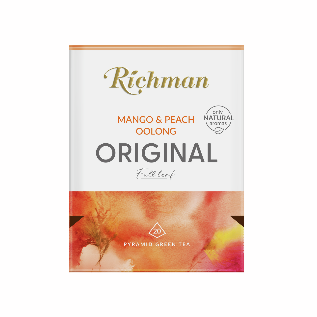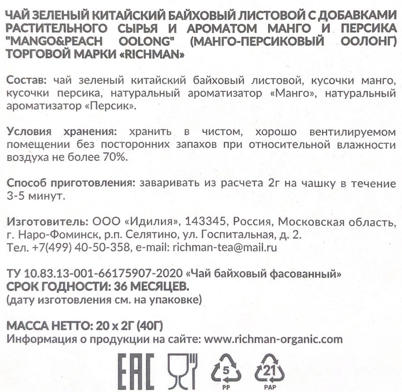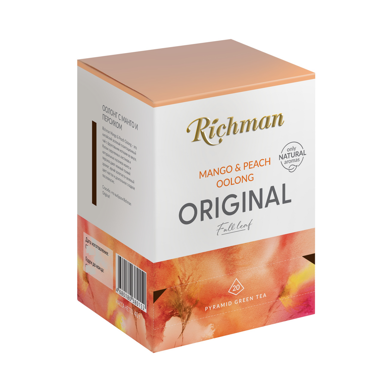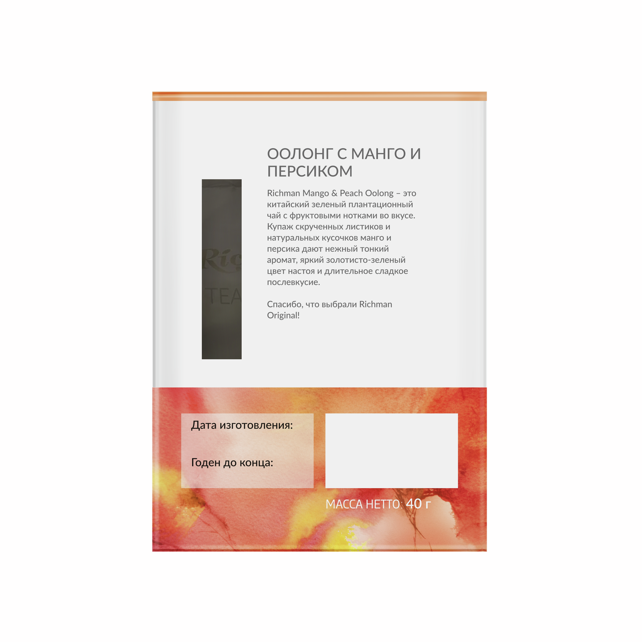 Richman Mango Peach Oolong – это китайский зеленый плантационный чай с фруктовыми нотками во вкусе. Купаж скрученных листиков и натуральных кусочков манго и персика дают нежный тонкий аромат, яркий золотисто-зеленый цвет настоя и длительное сладкое послевкусие.
