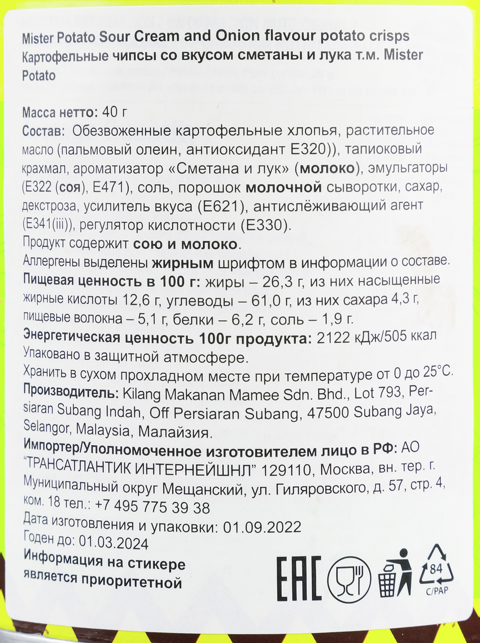 Обезвоженные картофельные хлопья, растительное масло пальмовый олеин, антиоксидант Е320, тапиоковый крахмал, ароматизатор Cметана и лук молоко, эмульгаторы Е322 соя, Е471, соль, порошок молочной сыворотки, сахар, декстроза, усилитель вкуса Е621, антислёживающий агент Е341iii, регулятор кислотности Е330. Продукт содержит сою и молоко.