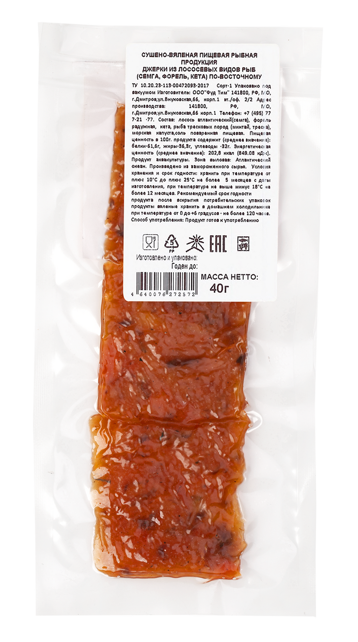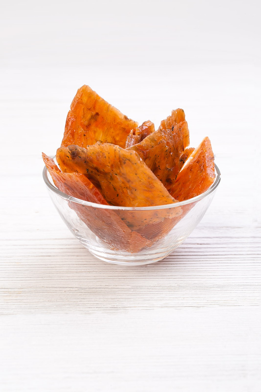 Джерки Laks+ с нори сушено-вяленые по-восточному, 40г – вкусный и полезный продукт, богатый белком. Джерки – это кусочки лосося, сделанные методом натурального копчения и естественной вялки. Такой продукт станет идеальной закуской к прохладным напиткам и сытным перекусом между основными приемами пищи. Благодаря вакуумной упаковке кусочки вяленого лосося легко взять с собой в дорогу и в офис. Джерки обладают приятным ароматом зелени и натуральным вкусом арктического лосося. Тонкие ломтики красивого янтарного оттенка очень мягкие и нежные, они буквально тают во рту.
