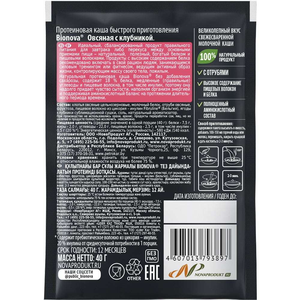 Натуральная протеиновая овсяная каша Bionova с клубникой без добавления сахара, содержит 18% белка, медленные (правильные) углеводы и пищевые волокна, в том числе инулин, поэтому она надолго придает чувство сытости, наполняя организм энергией и поддерживая аминокислотный баланс на протяжении длительного периода времени. Идеальный, сбалансированный продукт правильного питания для завтрака либо перекуса между основными приемами пищи – натуральный, полезный, богатый белком и пищевыми волокнами. Продукты с высоким содержанием белка рекомендовано включать в свой рацион людям, занимающимся силовым тренингом или фитнесом, ведущим активный образ жизни, контролирующим массу своего тела, пожилым. Натуральный сбалансированный продукт, который послужит отличным завтраком для всех, кто предпочитает здоровое питание. Это вкусная и полезная овсяная каша, обогащенная молочным белком. Содержит кусочки натуральной клубники. Ягоды подвергаются сублимационной сушке, что позволяет сохранить в них максимум ценных веществ. В составе продукта нет сахара, ГМО, сои, консервантов, ароматизаторов. Каша служит источником белка, правильных углеводов, инулина и клетчатки, поэтому оставляет длительное ощущение сытости, обогащает организм энергией и способствует комфортному пищеварению. Она не требует варки: просто добавьте к содержимому пакетика горячую воду или молоко, тщательно перемешайте, накройте крышкой и дайте настояться пару минут.