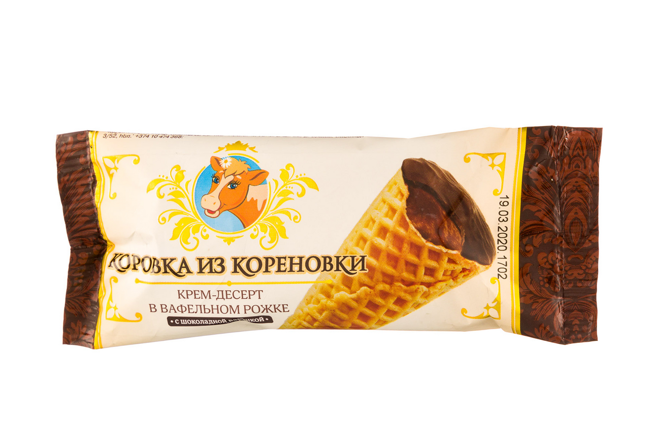 Собираетесь выпить чашечку чая или кофе? Не забудьте про крем-десерт Коровка из Кореновки! Крем-десерт с нежнейшей начинкой с вареным молоком и какао. Нежное лакомство в хрустящем вафельном рожке с начинкой из вареного сгущенного молока и сгущенных сливок собственного производства не оставит равнодушным ни одного сладкоежку. Начинка производится из сгущенного молока и сливок собственного производства. Высоко барьерная упаковка флоупак сохраняет свежесть и вкус продукта.