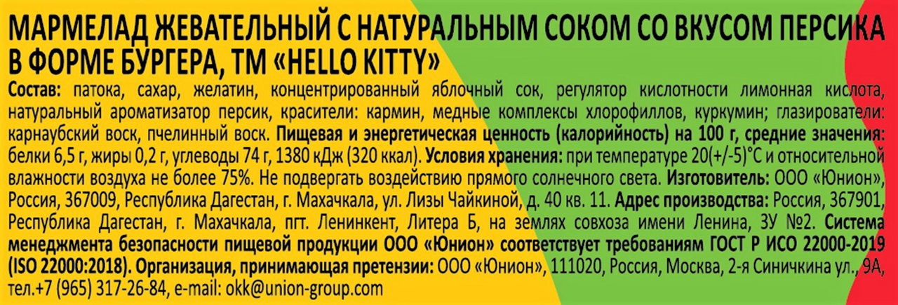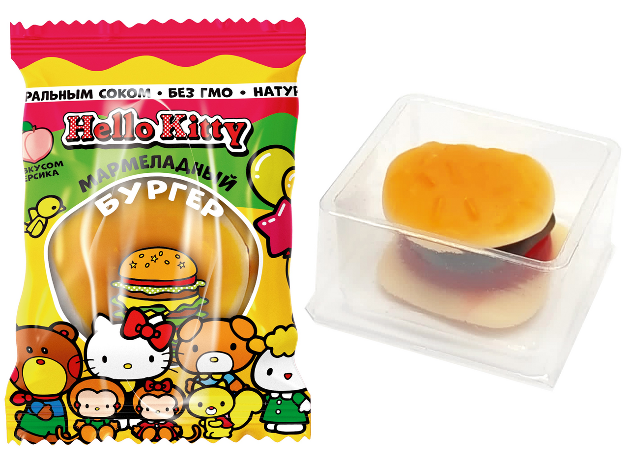Вкусный и сочный мармеладный бургер со вкусом персика. С натуральным соком. С натуральными красителями и ароматизаторами. Без пальмового масла. Без глютена. Без ГМО. Удобный порционный формат (мармеладный бургер в коррексе - 40г) и яркий дизайн упаковки с легендарной Hello Kitty.