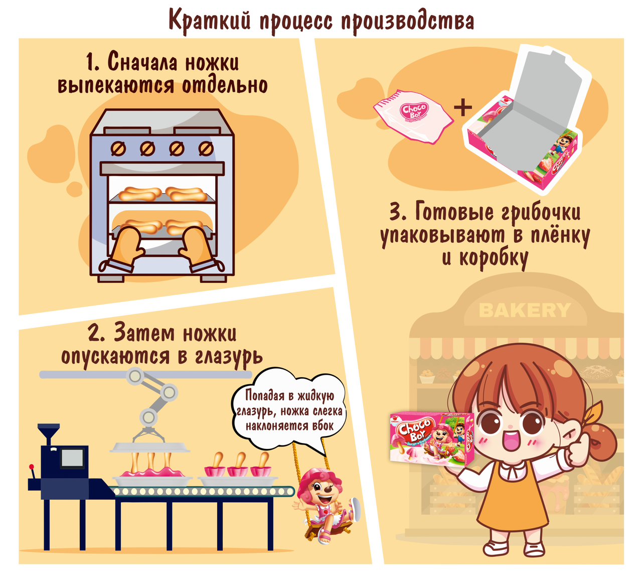 Это хрустящая ножка из нежного печенья со вкусом йогурта и клубники, а сверху шляпка из шоколадной глазури. Яркая упаковка сразу привлекает внимание маленьких сладкоежек. Можно съесть грибок полностью, оценив прекрасное сочетание шоколадной глазури и печенья, а можно по-отдельности, откусив шляпку и насладившись тем, как она медленно тает во рту. Это оригинальное и вкусное лакомство, уже полюбившееся детям и взрослым.