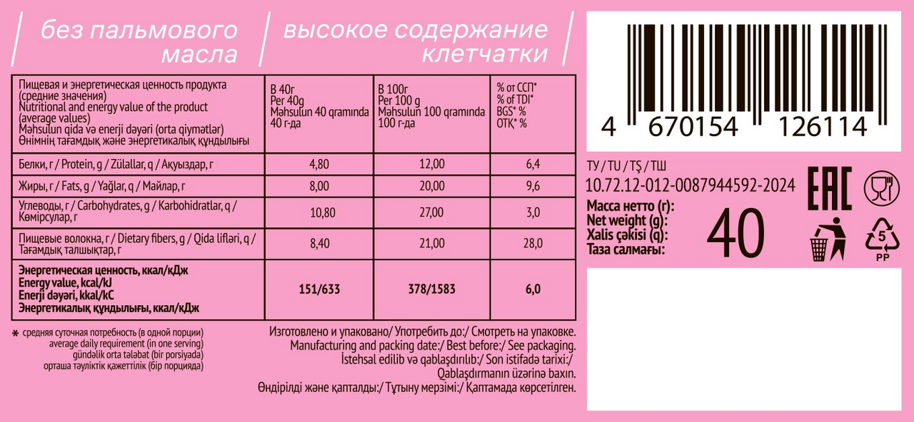 Мы создали то, о чем вы мечтали: идеальный перекус, который восхищает вкусом и дарит пользу. В основе - насыщенный шоколадный брауни, а внутри - сочная, влажная начинка, которая превращает каждый кусочек в маленький праздник. Это полноценное удовольствие без компромиссов. Печенье без сахара покрыто нежной глазурью, подчеркивающей яркость начинки и добавляющей десерту особую привлекательность. Оно не содержит сахара и пальмового масла, что делает его подходящим для правильного питания.