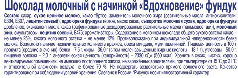 Сахар, сухое цельное молоко, какао тертое, заменитель молочного жира (растительные масла, антиокислители: Е304, Е307, лецитин соевый), ядро ореха фундука тертое, масло какао, сыворотка молочная сухая, ядро ореха фундука дробленое, эквивалент масла какао (рафинированные дезодорированные растительные масла (пальмовое, ши)), молочный жир, эмульгаторы: лецитин соевый, Е476, ароматизаторы.