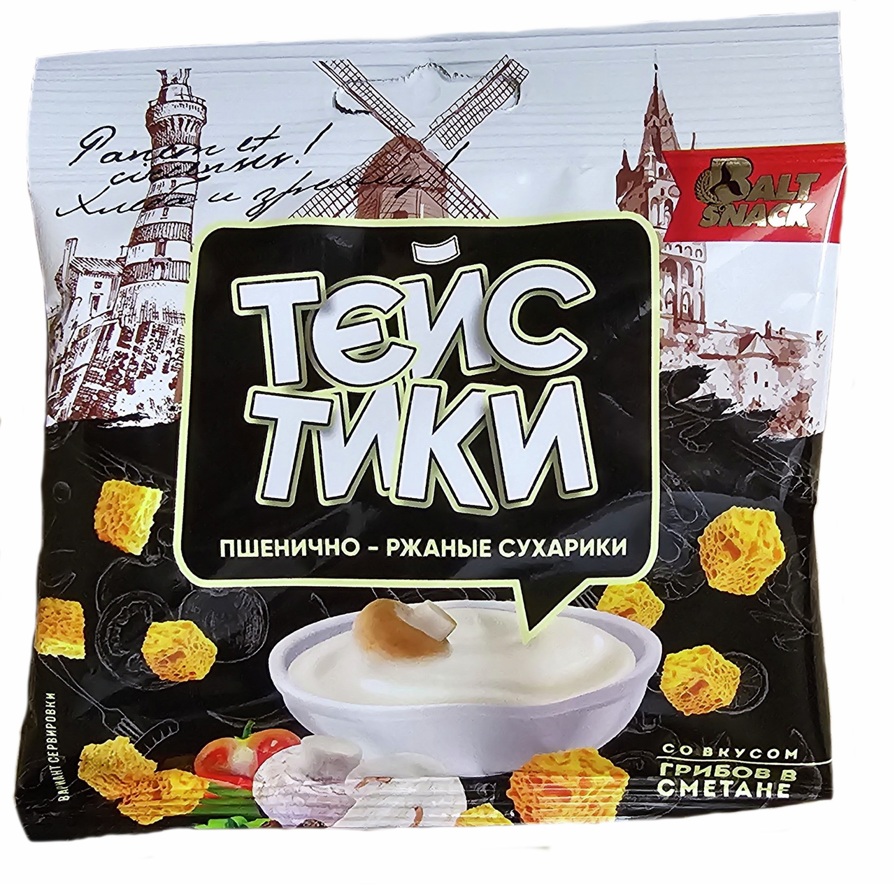 Сухарики Тейстики произведены в Калининградской области из хлеба собственного производства. Для производства хлеба берутся только натуральные ингредиенты: мука пшеничная 1 сорт, мука ржаная обдирная, вода питьевая, живые дрожжи, соль. Для придания вкуса и аромата продукции используются лучшие специи и ароматические добавки. Сухарики отлично подойдут для легкого и полезного перекуса. Продукцию можно использовать как дополнительный ингредиент в кулинарных изделиях: овощных и мясных салатах, супах и бульонах. Это вкусный и сытный перекус, который подойдет для любителей грибного вкуса.
