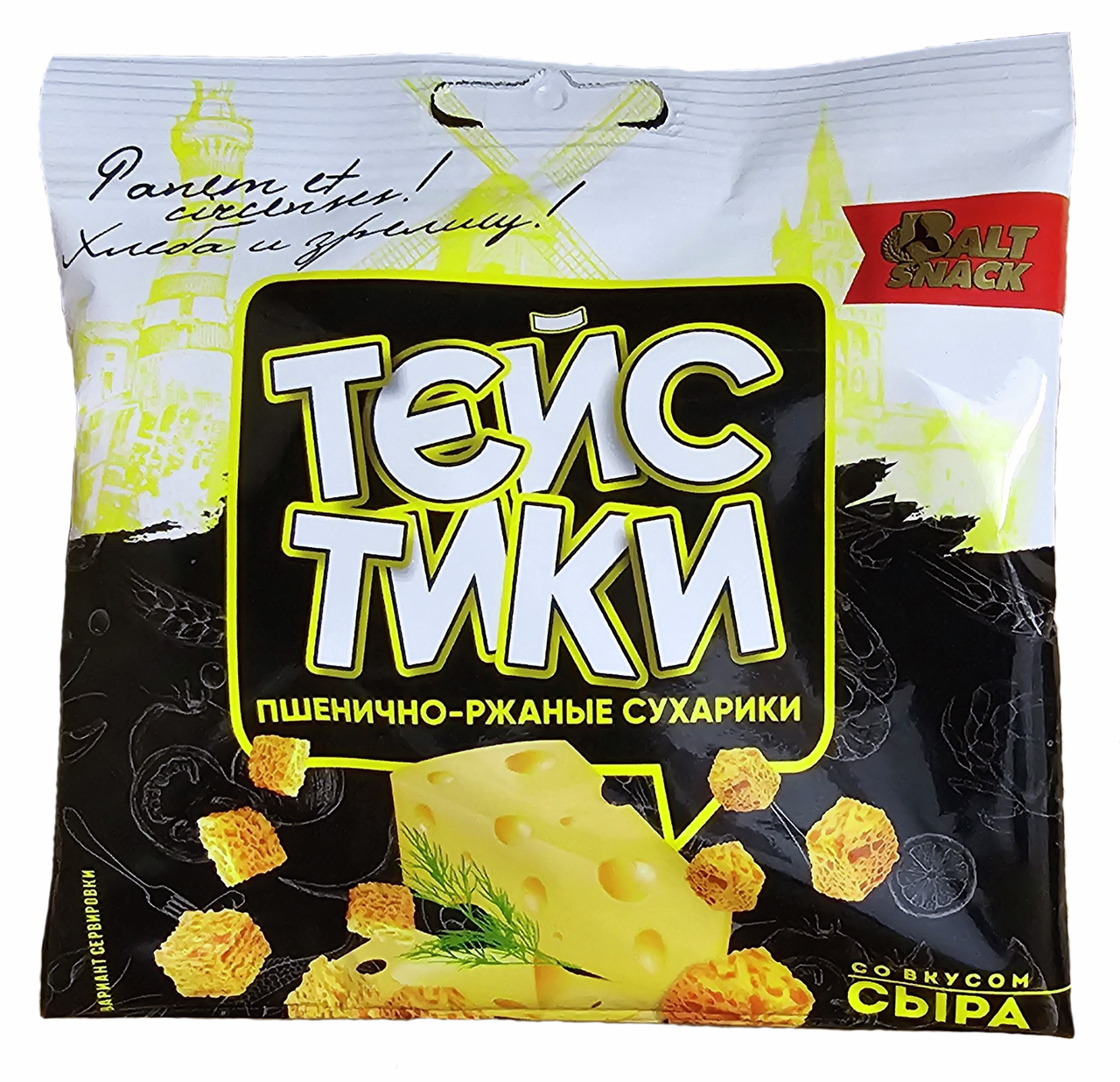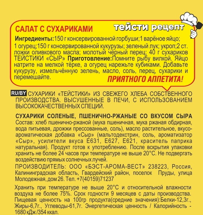 Сухарики Тейстики произведены в Калининградской области из хлеба собственного производства. Для производства хлеба берутся только натуральные ингредиенты: мука пшеничная 1 сорт, мука ржаная обдирная, вода питьевая, живые дрожжи, соль. Для придания вкуса и аромата продукции используются лучшие специи и ароматические добавки. Сухарики отлично подойдут для легкого и полезного перекуса. Продукцию можно использовать как дополнительный ингредиент в кулинарных изделиях: овощных и мясных салатах, супах и бульонах.Это оригинальные хрустящие снеки с воздушной пористой структурой и изысканным вкусом благородных сыров. Сухарики приятно хрустят и с легкостью раскусываются. Их можно употреблять в качестве вкусного и сытного перекуса, легкой закуски к прохладительным напиткам, подавать в качестве гренок к крем-супу, использовать для приготовления знаменитого салата Цезарь.