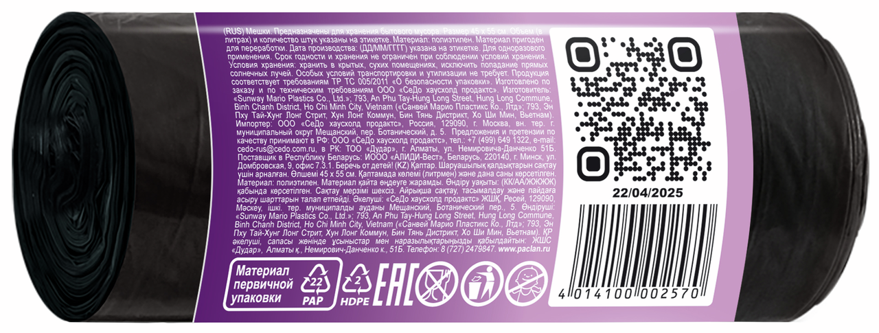 Пакеты для мусора Paclan Standart - универсальные и удобные, идеально подходят для домашнего использования.Позволяют поддерживать полноценный порядок в помещениях и обеспечивают комфортные условия для ежедневной уборки легкого бытового мусора. Пакет имеет классическую прямую горловину. Дно в форме звезда выдерживает вес мусора, так как оно изготовлено из восьми спаянных слоев полиэтилена.