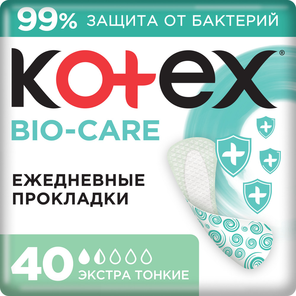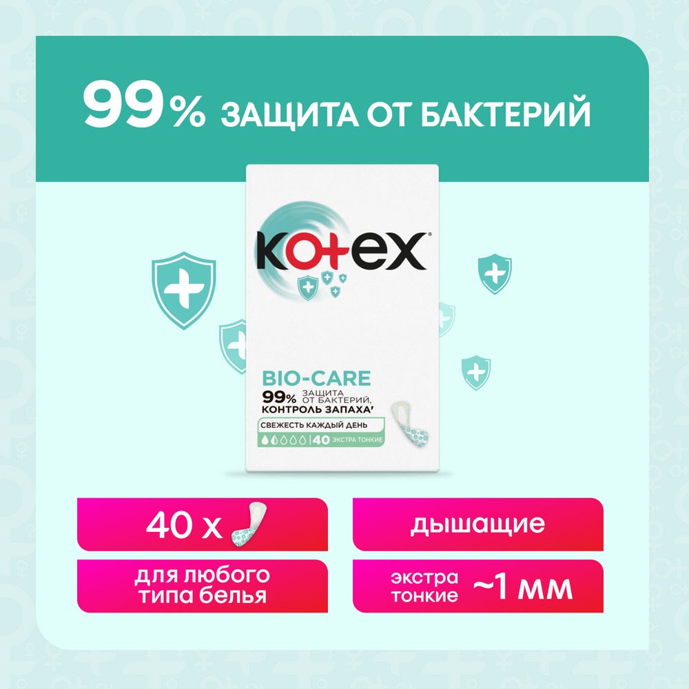 Ежедневные прокладки созданы специально для потребностей современных девушек, которые хотят быть уверены в своей защите и отсутствии неприятного запаха. Благодаря наличию специального натурального природного антибактериального слоя внутри новые ежедневки Котекс Bio-Care обеспечивают 99% защиту от бактерий и контроль запаха: компоненты антибактериального слоя воздействуют на бактерии, вызывающие неприятный запах, не давая им размножаться. Антибактериальный слой находится внутри прокладки, не соприкасаясь с V-зоной и не воздействуя на неё. Ежедневные прокладки экстратонкие, ~1мм в толщину, что позволяет коже дышать и обеспечивает комфорт, свежесть и уверенность на протяжении всего дня. В упаковке 20 прокладок, которые удобно использовать каждый день, так как они подходят для любого типа белья и имеют мягкий внутренний слой, а верхнее 3D покрытие дарит ощущение защиты.