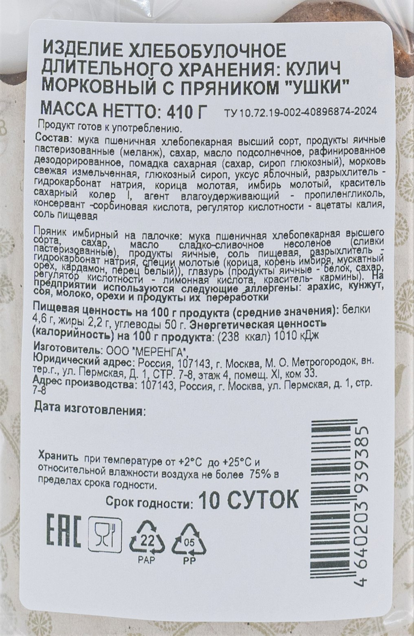 Кулич морковный с ушками, 410г