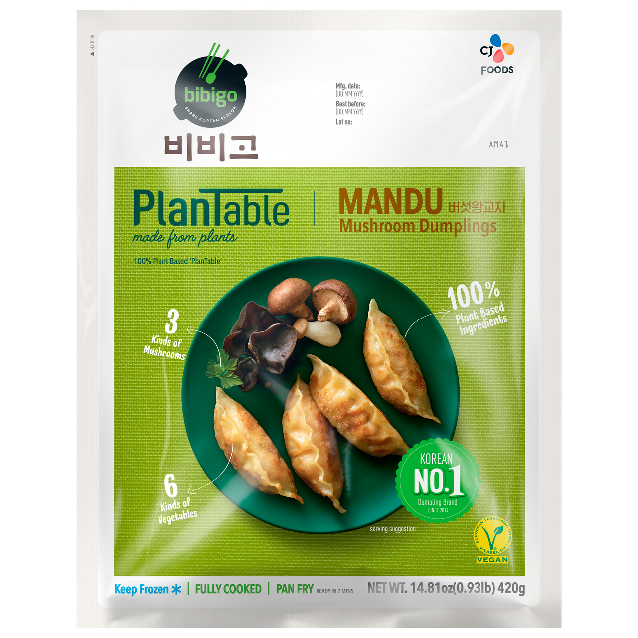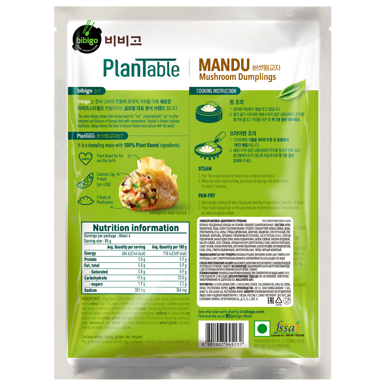 Линейка продуктов питания растительного происхождения Plan Table (Веган), Дамплинги с начинкой из грибного ассорти и овощей. Оригинальное блюдо, приготовленное по рецепту корейской кухни. Оно состоит из упругого тонкого теста, под которым скрывается нежная начинка из грибов, овощей и специй. Дамплинги легко и быстро готовятся, позволяют разнообразить привычный рацион, хорошо насыщают и подходят тем, кто придерживается постного или вегетарианского питания.
