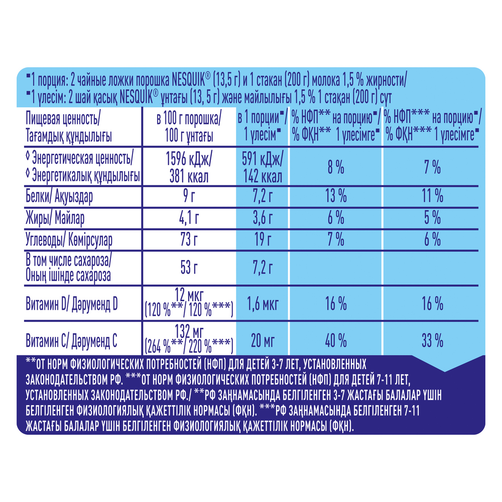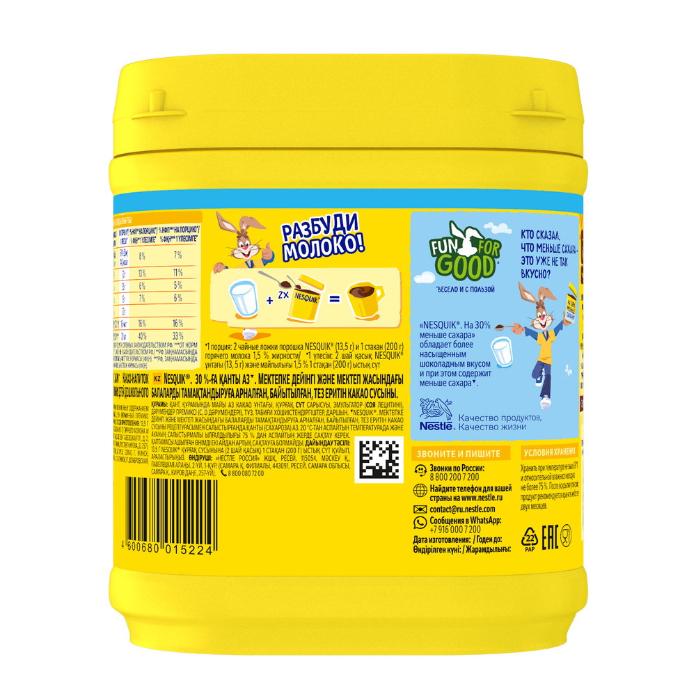NESQUIK. На 30% меньше сахара. Какао-напиток быстрорастворимый, обогащенный для питания детей дошкольного и школьного возраста. NESQUIK на 30% меньше сахара - это баланс вкуса и пользы для отличного начала дня! Ведь с ним завтрак веселее!NESQUIK на 30% меньше сахара - такой же вкусный, полезный и питательный, но с меньшим содержанием сахара. А еще он и дополняет пользу молока витаминами. Витамин D способствует усвоению кальция из молока, а также необходим для крепких и здоровых костей. А витамин С способствует нормальному функционированию иммунной системы, росту и развитию детского организма. С какао из Западной Африки.NESQUIK. Растем весело!В составе какао-порошок. Попробуйте ваш любимый Несквик!
