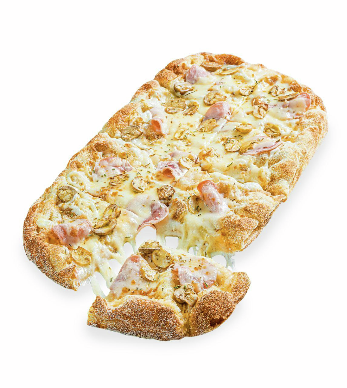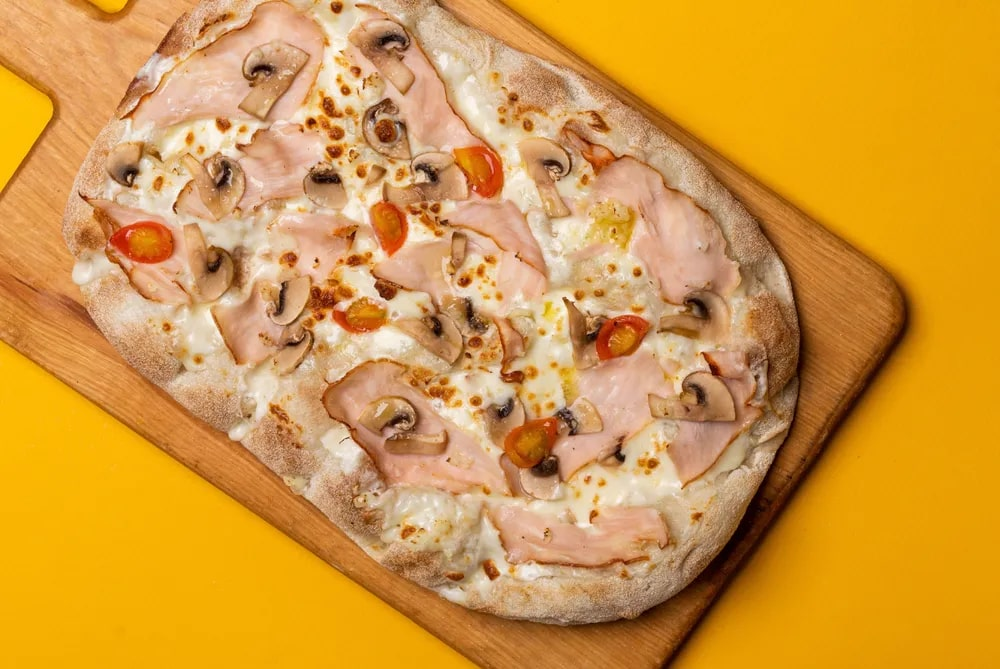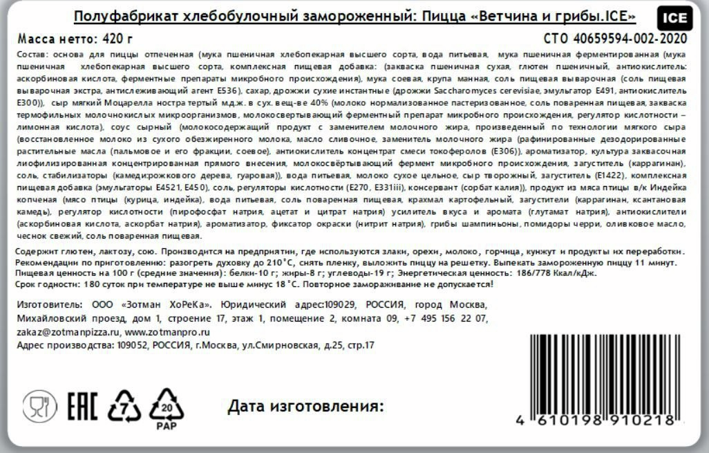 Основа для пиццы отпеченная мука пшеничная хлебопекарная высшего сорта, вода питьевая, мука пшеничная ферментированная мука пшеничная хлебопекарная высшего сорта, комплексная пищевая добавка: закваска пшеничная сухая, глютен пшеничный, антиокислитель: аскорбиновая кислота, ферментные препараты микробного происхождения, мука соевая, крупа манная, соль пищевая выварочная соль пищевая выварочная экстра, антислеживающий агент Е536, сахар, дрожжи сухие инстантные дрожжи Saccharomyces cerevisiae, эмульгатор Е491, антиокислитель Е300, масло подсолнечное рафинированное дезодорированное первого сорта, сыр мягкий моцарелла ностра тертый м. д. ж. в сух. вещ-ве 40% молоко нормализованное пастеризованное, соль поваренная пищевая, закваска термофильных молочнокислых микроорганизмов, молокосвертывающий ферментный препарат микробного происхождения, регулятор кислотности – лимонная кислота, антислеживающий агент-Е551, консерват-Е202, соус сырный молокосодержащий продукт с заменителем молочного жира, произведенный по технологии мягкого сыра восстановленное молоко из сухого обезжиренного молока, масло сливочное, заменитель молочного жира рафинированные дезодорированные растительные масла пальмовое и его фракции, соевое, антиокислитель концентрат смеси токоферолов Е306, ароматизатор, культура заквасочная лиофилизированная концентрированная прямого внесения, молокосвёртывающий фермент микробного происхождения, загуститель каррагинан, соль, стабилизаторы камеди: рожкового дерева, гуаровая, вода питьевая, молоко сухое цельное, сыр творожный, загуститель Е1422, комплексная пищевая добавка эмульгаторы Е4521, Е450, соль, регуляторы кислотности Е270, Е331iii, консервант сорбат калия, продукт из мяса птицы в/к Индейка копченая мясо птицы курица, индейка, вода питьевая, соль поваренная пищевая, крахмал картофельный, загустители каррагинан, ксантановая камедь, регулятор кислотности пирофосфат натрия, ацетат и цитрат натрия усилитель вкуса и аромата глутамат натрия, антиокислители аскорбиновая кислота, аскорбат натрия, ароматизатор, фиксатор окраски нитрит натрия, грибы шампиньоны, помидоры черри, оливковое масло, чеснок свежий, соль пищевая выварочная соль пищевая выварочная экстра, антислеживающий агент Е536. Содержит глютен и лактозу.