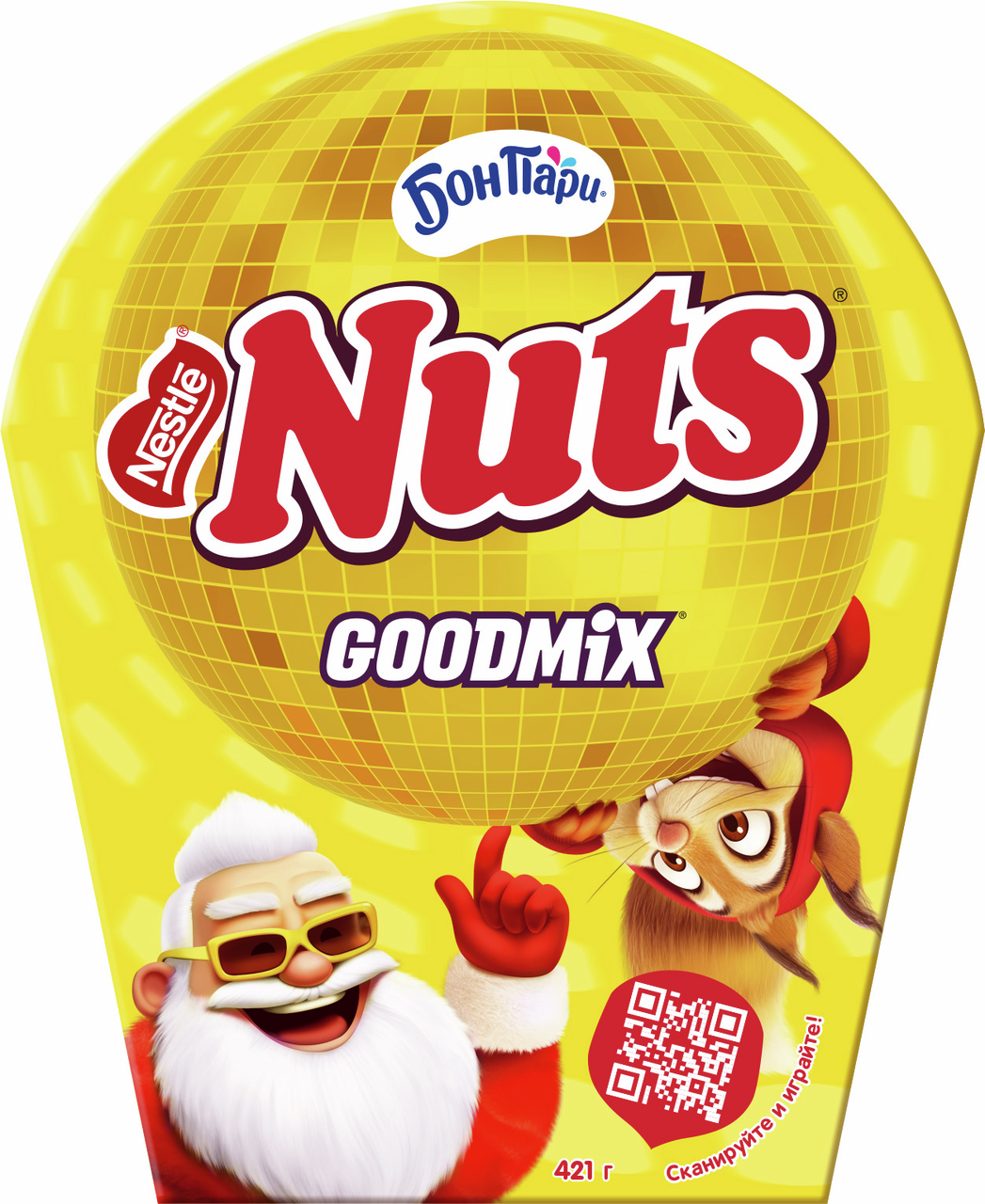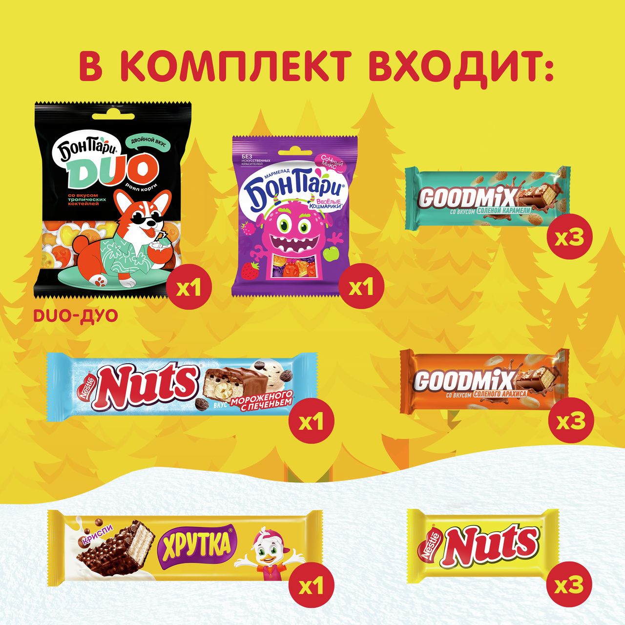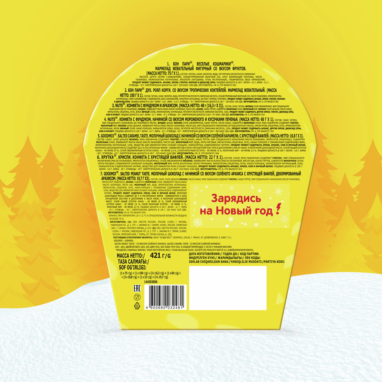Бон Пари Кошмарики: патока, сахар, желатин, вода, регуляторы кислотности лимонная кислота, цитрат натрия 3-замещенный, концентрированный яблочный сок, агент желирующий пектины, красители антоцианы получен из моркови, уголь растительный, ароматизаторы натуральные, масло пальмовое, глазирователь воск карнаубский, Бон Пари Duo Jelly Corgi: концентрированный яблочный сок, масло пальмовое, ароматизаторы натуральные, сироп карамельный, глазирователь воск карнаубский, красители антоцианы, экстракт паприки, куркумин; Конфета с фундуком и арахисом: фундук, эквивалент масла какао масло пальмовое, масло ши, арахис, какао тертое, белок яичный сухой, ароматизаторы натуральные, регулятор кислотности лимонная кислота, соль; Nuts Duo Мороженое и печенье: мука пшеничная содержит глютен, молочный жир, молоко сухое цельное, эквивалент масла какао масло пальмовое, масло ши, жир специального назначения из подсолнечного масла, эмульгаторы лецитины, Е476, ароматизаторы натуральные, белок яичный сухой, какао-порошок, разрыхлители Е500II, E503II, регулятор кислотности лимонная кислота, соль; Goodmix Salted caramel taste Мини: молочный жир, вода, крупа рисовая, эмульгаторы лецитины, Е476, какао-порошок с пониженным содержанием жира, ароматизаторы натуральные, соль, вещество для обработки муки сульфат кальция, разрыхлитель гидрокарбонат натрия; Хрутка: крупа кукурузная, крупа гречневая, эмульгаторы лецитины, E476, какао-порошок, ароматизатор натуральный, соль, разрыхлитель гидрокарбонат натрия, вещество для обработки муки сульфат кальция; Goodmix Salted Peanut taste Мини: арахис, сыворотка молочная сухая, эквивалент масла какао масло пальмовое, масло ши, молочный жир, вода, ароматизаторы натуральные, эмульгаторы лецитины, Е476, какао-порошок с пониженным содержанием жира, соль, вещество для обработки муки сульфат кальция, разрыхлитель гидрокарбонат натрия.