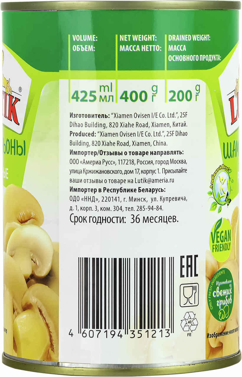 Грибы шампиньоны Lutik резаные, 425мл