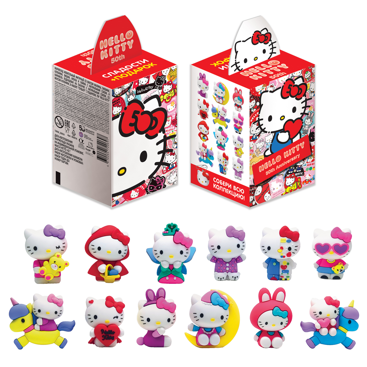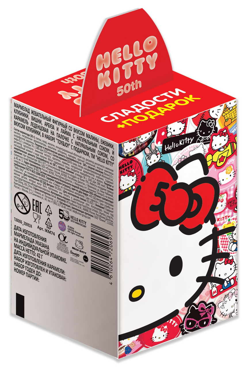В составе набора: 30г жевательного мармелада в эксклюзивной форме Hello Kitty со вкусом сочных ягод, в кисло-сладкой обсыпке. С натуральным соком. С натуральными красителями и ароматизаторами. Без пальмового масла, глютена и ГМО. Карамель на палочке со вкусом спелой клубники. С натуральным соком. С натуральными красителями и ароматизаторами. Невероятной красоты и милоты игрушка. В коллекции 3D-фигурок - 12 образов неотразимой Hello Kitty. Все фигурки выполнены из мягкого, тактильно приятного материала, а качество исполнения настолько высокое, что хочется коллекционировать и любоваться целыми днями. Почувствуйте праздник вместе с набором Toy Joy Hello Kitty.